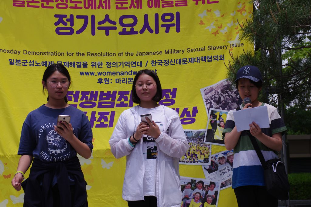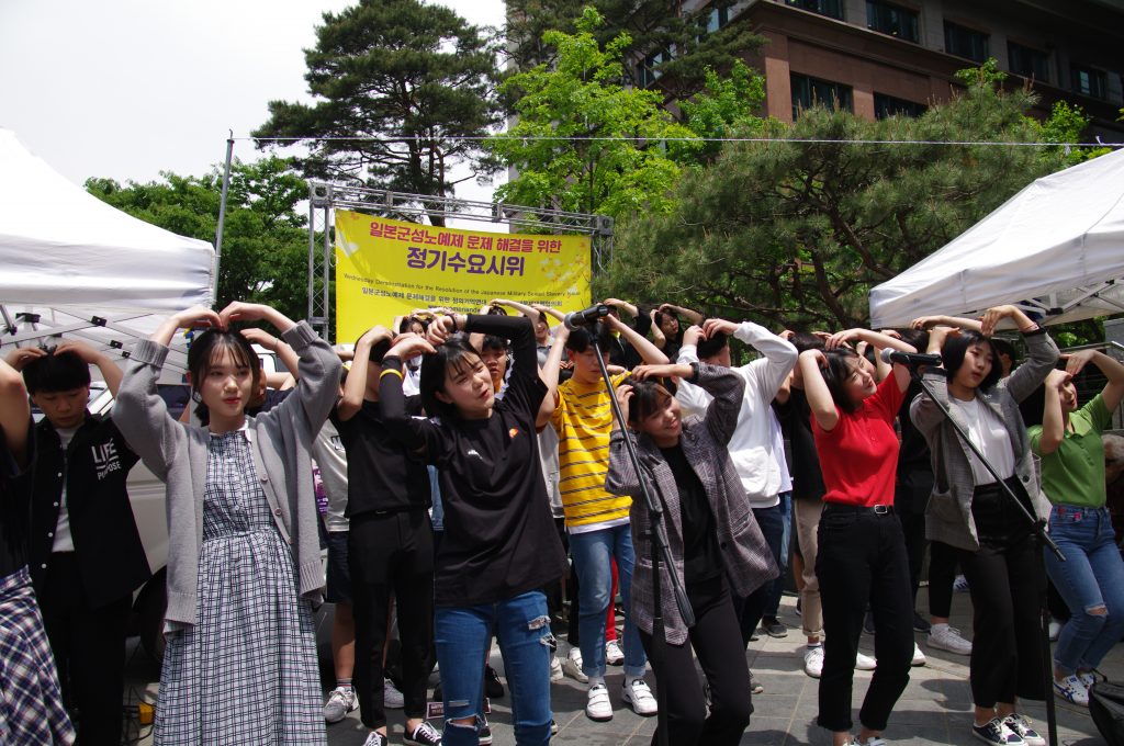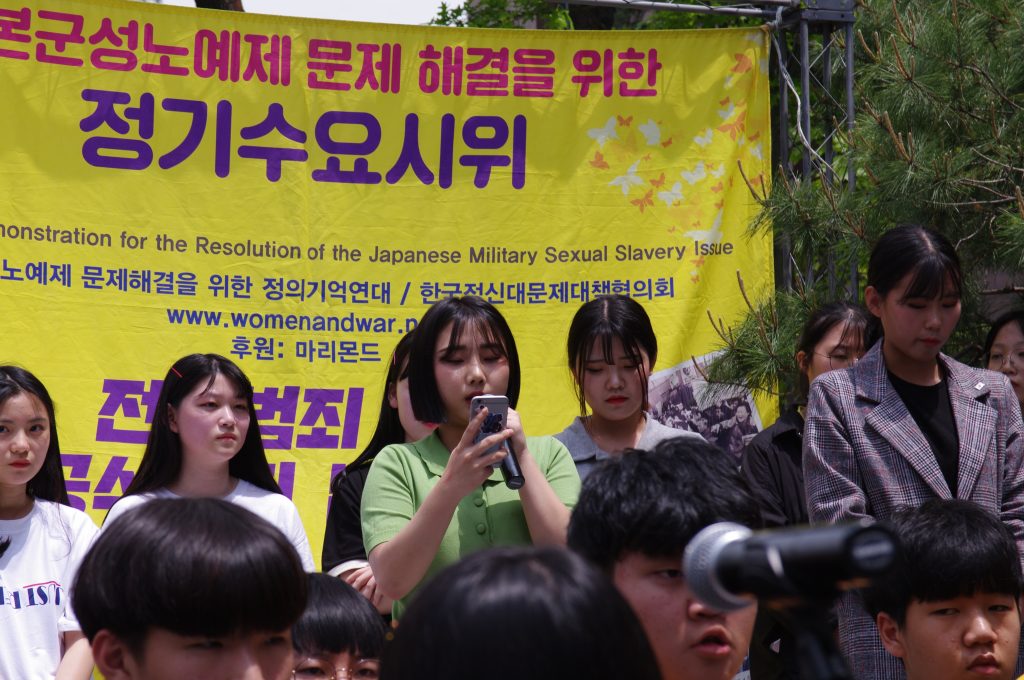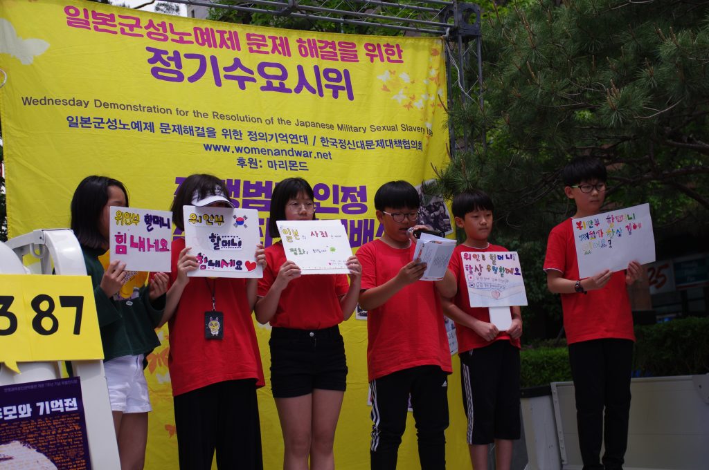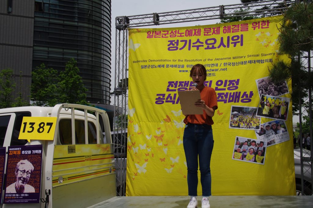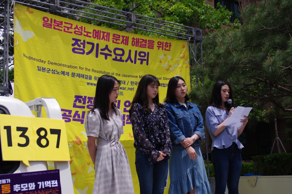 일본군성노예제 문제해결을 위한 1387차 수요시위에는 초여름 날씨에도 많은 분들이 함께해주셨습니다. 나눔의 집에 계시는 이옥선 할머니께서 오랜만에 참석하셨고, 나눔의 집 활동가들도 함께하였습니다. 동구천 동보초등학교 6학년, 구리여자고등학교 동아리 ‘한국의 아이들’, 화성 창의고등학교, 한국순교복자수녀회 수원관구, 광명 온신초등학교 6학년, 부천여자고등학교 1, 2학년, 성남 보평초등학교 동아리 앱스 ‘위안부는 살아 있다’팀, 서울 석관초등학교 4, 6학년, 용인 백봉초등학교 5, 6학년, 인천 인항고등학교 3학년, 평화나비네트워크, 독일코리아협의회, 그리고 오늘 수요시위 주관을 맡은 마리몬드 등 300여 명이 함께하였습니다.