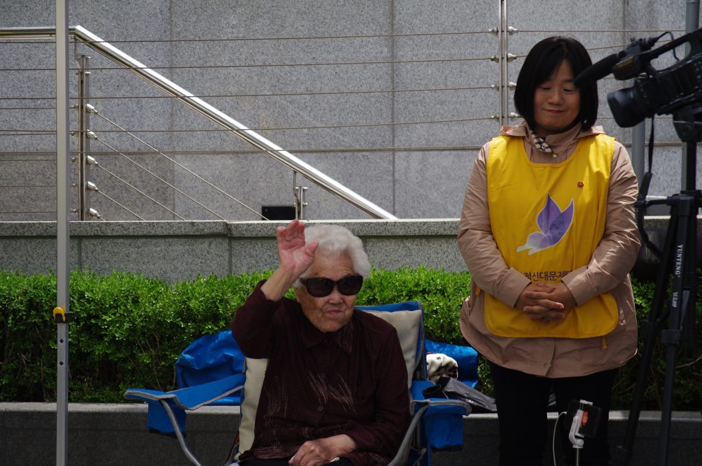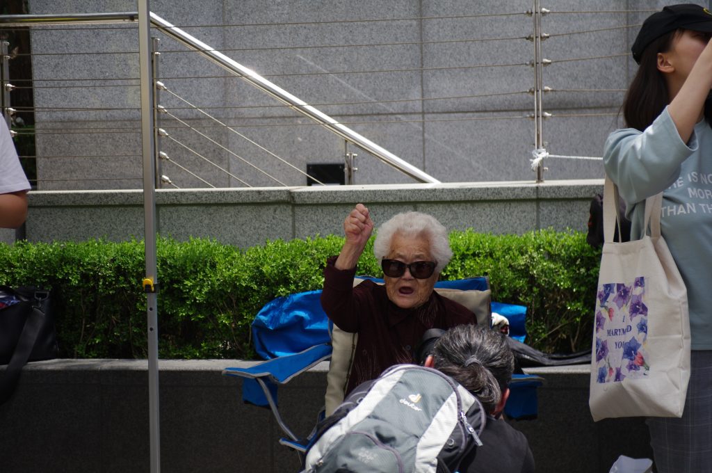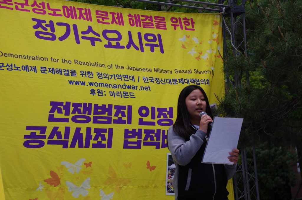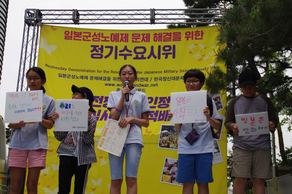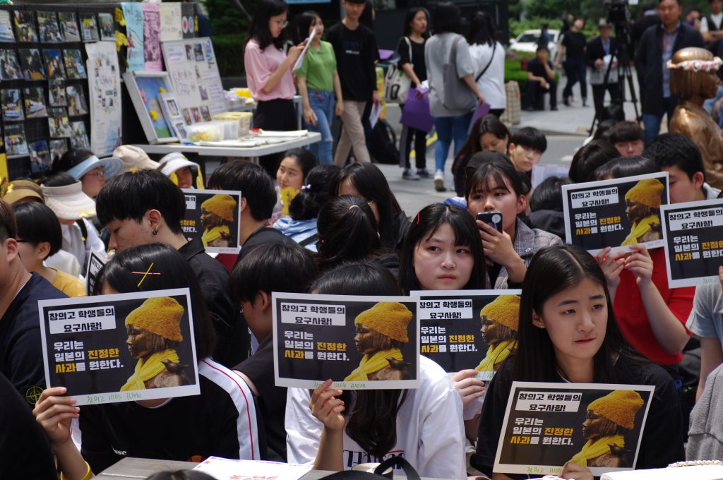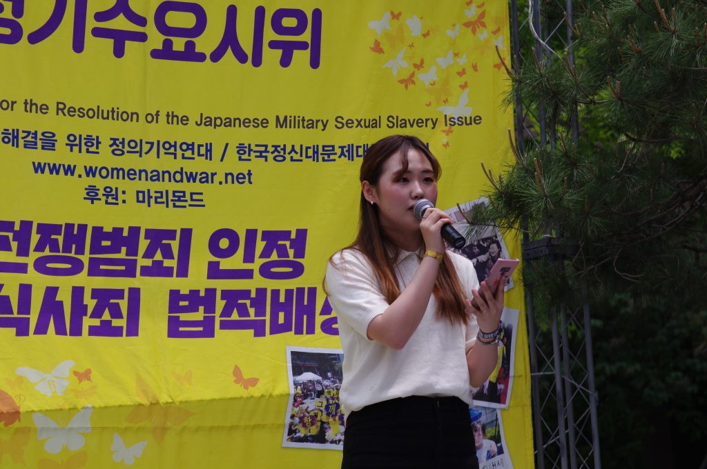 일본군성노예제 문제해결을 위한 1387차 수요시위에는 초여름 날씨에도 많은 분들이 함께해주셨습니다. 나눔의 집에 계시는 이옥선 할머니께서 오랜만에 참석하셨고, 나눔의 집 활동가들도 함께하였습니다. 동구천 동보초등학교 6학년, 구리여자고등학교 동아리 ‘한국의 아이들’, 화성 창의고등학교, 한국순교복자수녀회 수원관구, 광명 온신초등학교 6학년, 부천여자고등학교 1, 2학년, 성남 보평초등학교 동아리 앱스 ‘위안부는 살아 있다’팀, 서울 석관초등학교 4, 6학년, 용인 백봉초등학교 5, 6학년, 인천 인항고등학교 3학년, 평화나비네트워크, 독일코리아협의회, 그리고 오늘 수요시위 주관을 맡은 마리몬드 등 300여 명이 함께하였습니다.