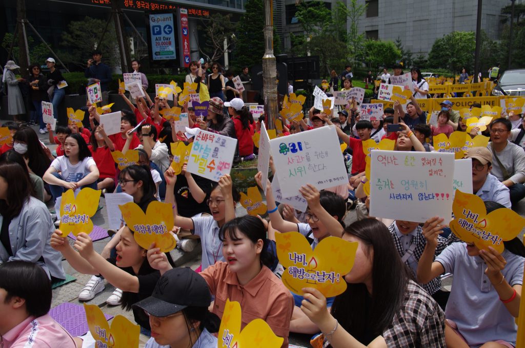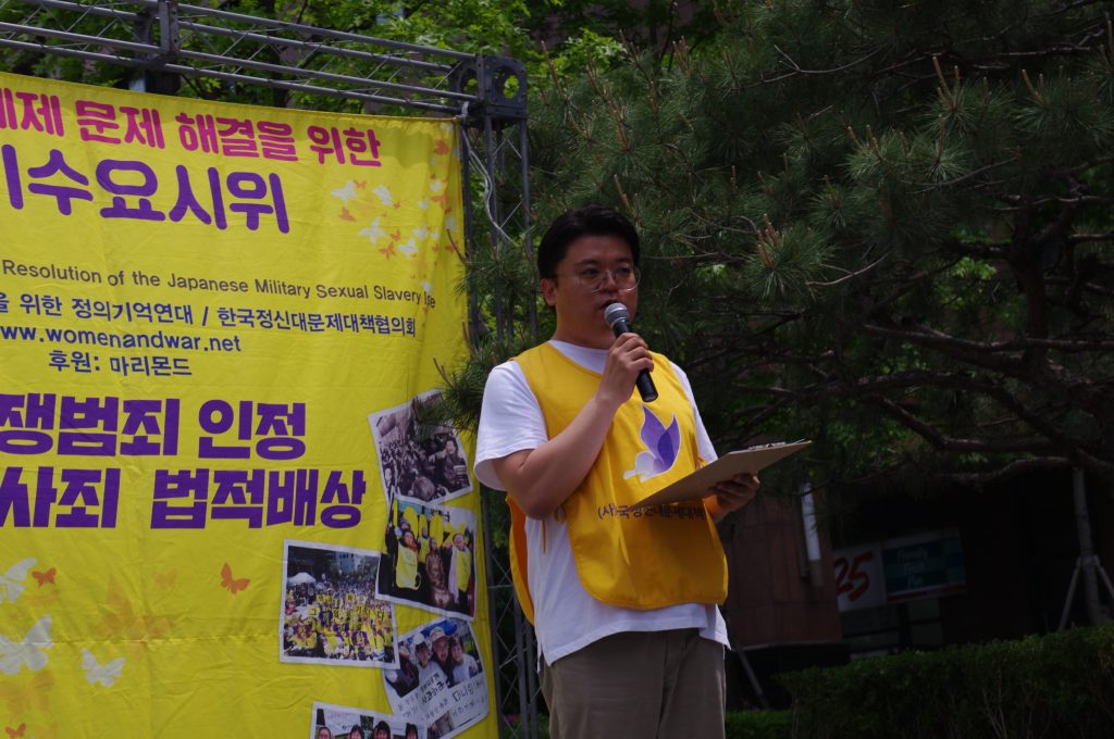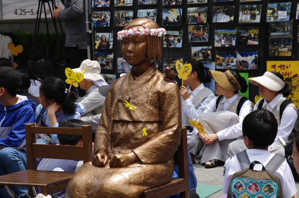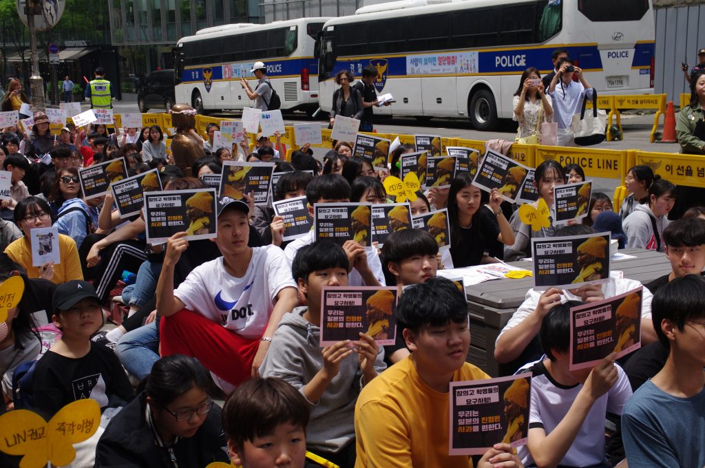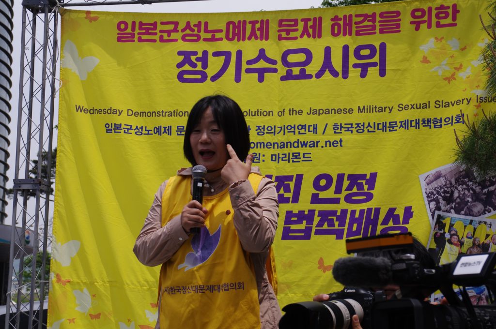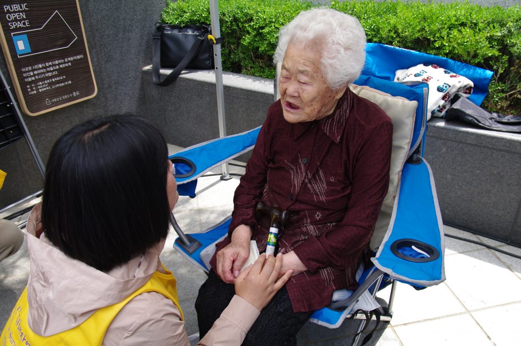 일본군성노예제 문제해결을 위한 1387차 수요시위에는 초여름 날씨에도 많은 분들이 함께해주셨습니다. 나눔의 집에 계시는 이옥선 할머니께서 오랜만에 참석하셨고, 나눔의 집 활동가들도 함께하였습니다. 동구천 동보초등학교 6학년, 구리여자고등학교 동아리 ‘한국의 아이들’, 화성 창의고등학교, 한국순교복자수녀회 수원관구, 광명 온신초등학교 6학년, 부천여자고등학교 1, 2학년, 성남 보평초등학교 동아리 앱스 ‘위안부는 살아 있다’팀, 서울 석관초등학교 4, 6학년, 용인 백봉초등학교 5, 6학년, 인천 인항고등학교 3학년, 평화나비네트워크, 독일코리아협의회, 그리고 오늘 수요시위 주관을 맡은 마리몬드 등 300여 명이 함께하였습니다.