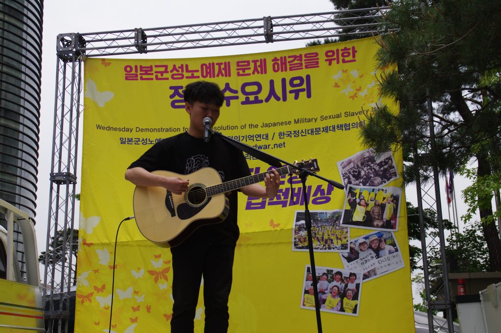 참가단체 소개 후 동보초등학교 6학년 박예연, 보평초등학교 6학년 장재인, 석관초등학교 홍인우(박하늘, 심지나, 임재나, 장윤성, 최준우), 백봉초등학교 6학년 민주은, 박혜리, 곽현아, 영복여자고등학교 2학년 신은채, 정하영, 김지현, 이혜인 학생의 자유발언이 이어졌습니다. 그리고 창의고등학교 1학년 이유림, 곽채은 학생의 자유발언 후 30여 명이 함께하는 <사랑받기 위해 태어난 사람> 노래와 율동공연을 진행했습니다. 마지막으로 성명서 낭독 후 일본군성노예제 문제해결을 위한 1387차 수요시위는 끝을 맺었습니다.