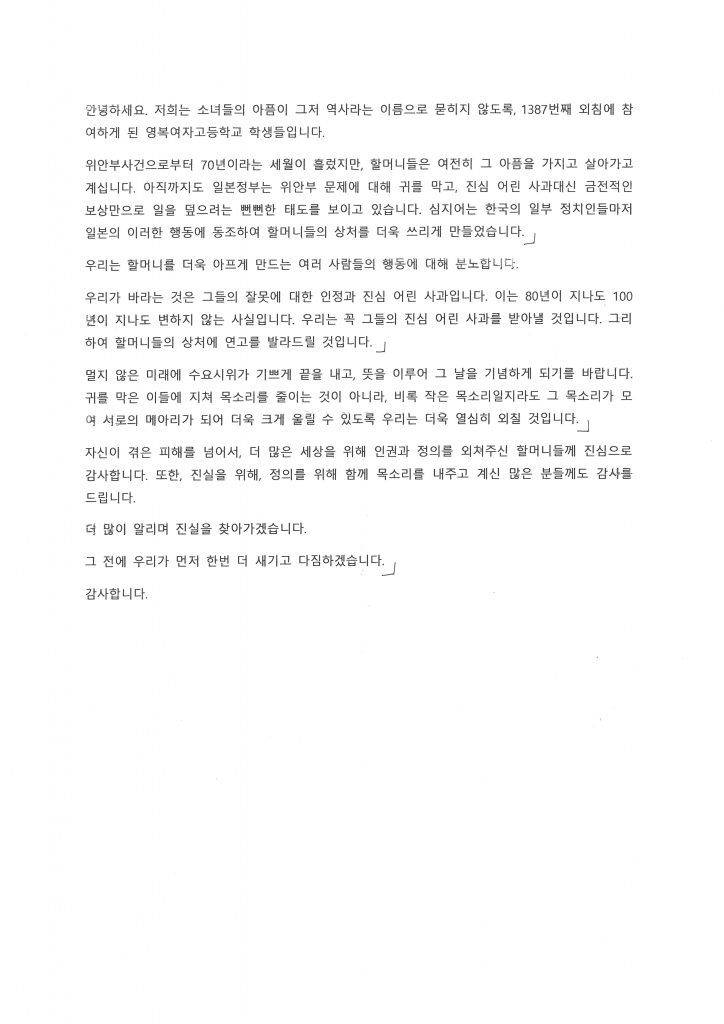 오늘 소개한 박옥련 할머니의 삶과 영복여자고등학교 학생들의 자유발언문을 소개합니다.