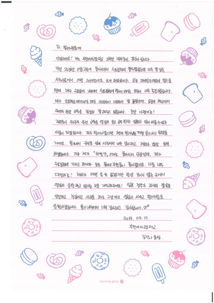 오늘 수요시위 시작 전 부천여자고등학교 학생들이 할머니들께 정성스럽게 쓴 편지를 주셨습니다. 할머니께 소중히 전달하도록 하겠습니다.