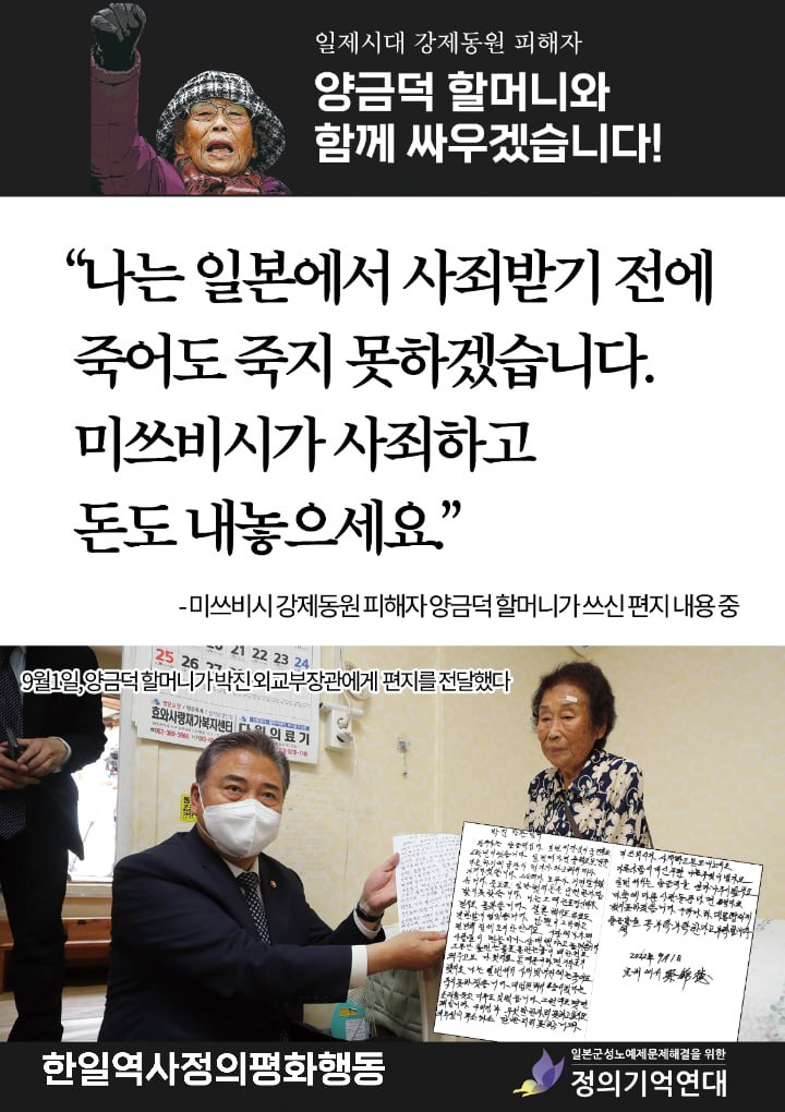 "나는 일본에서 사죄받기 전에 죽어도 죽지 못하겠습니다. 미쓰비시가 사죄하고 돈도 내놓으세요."