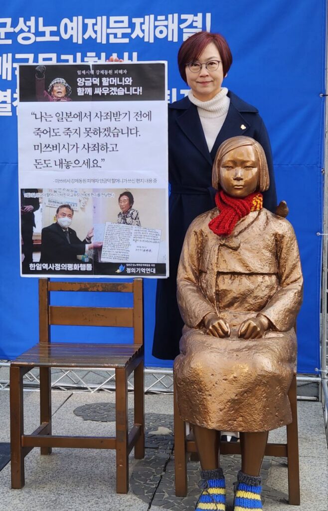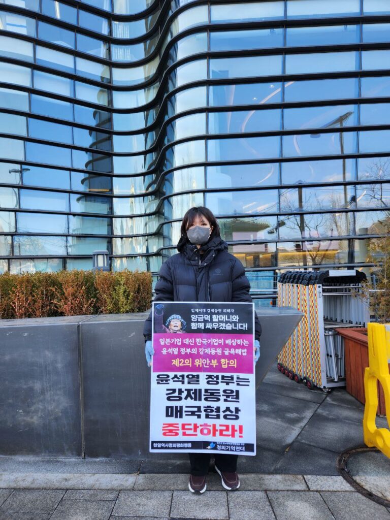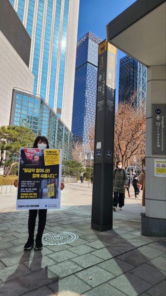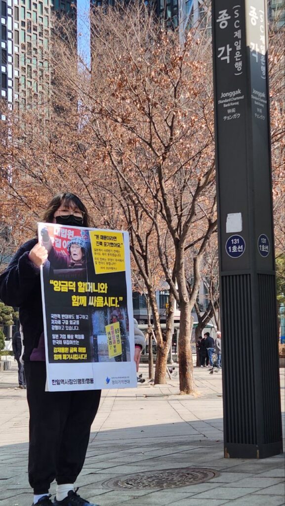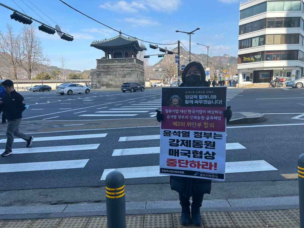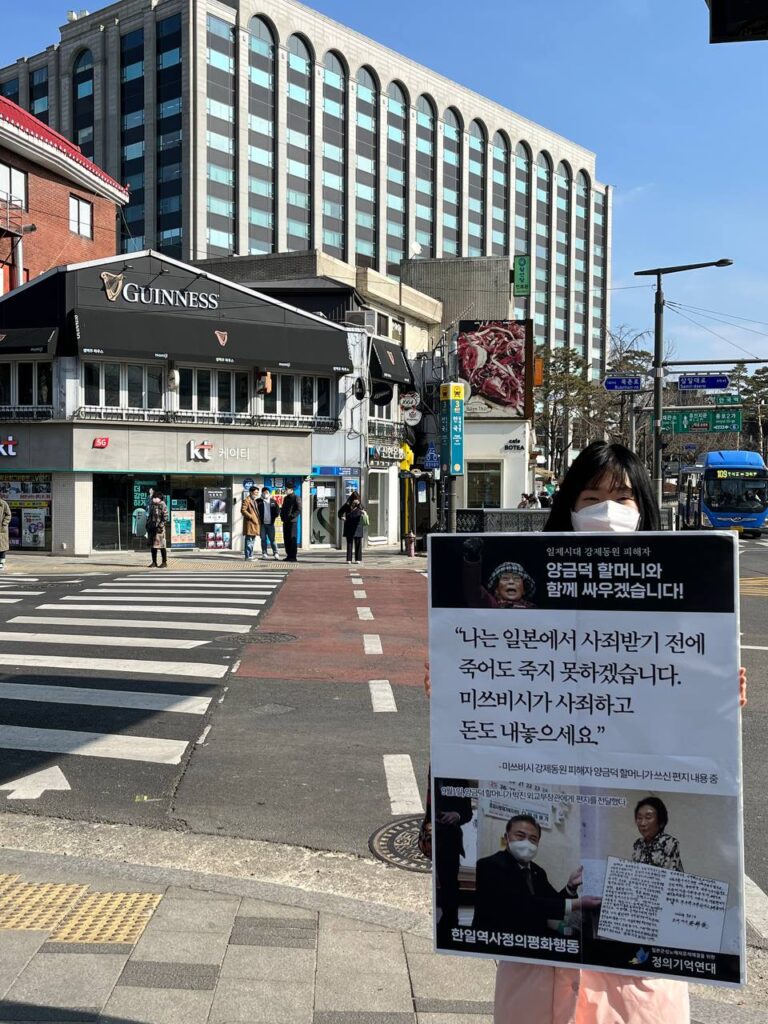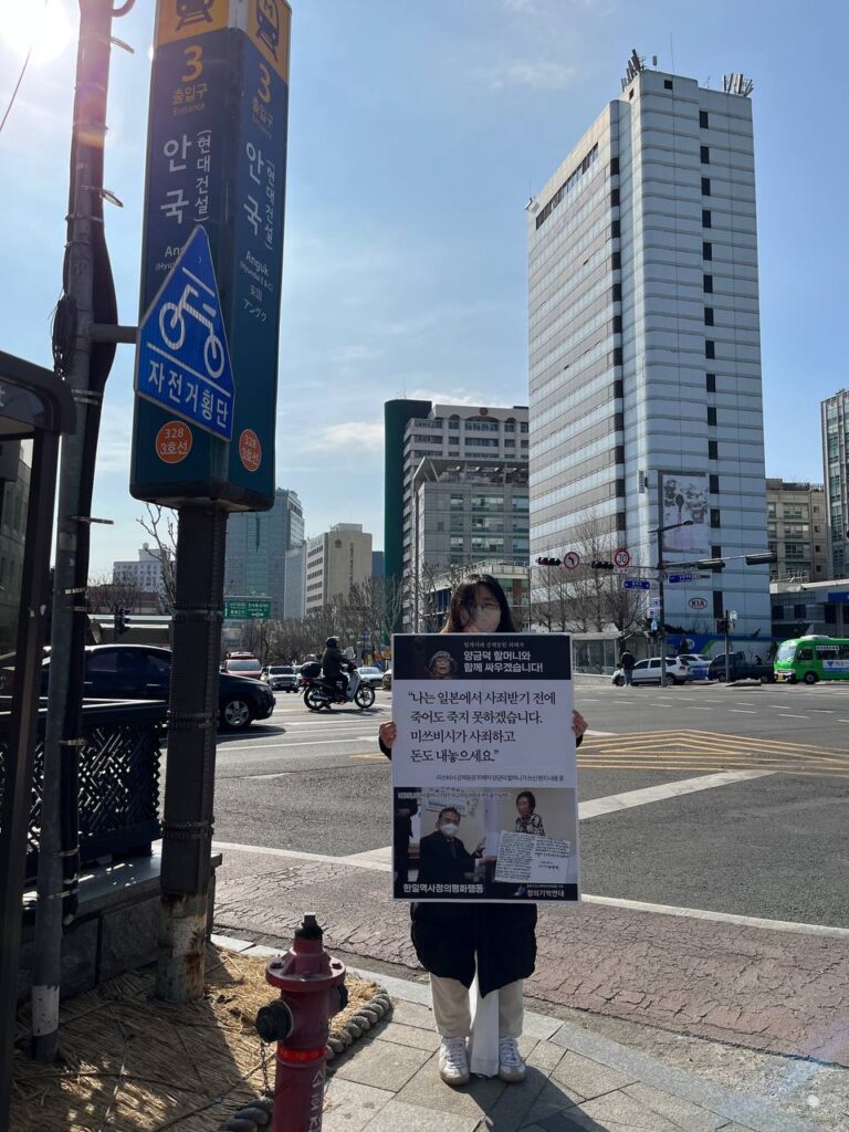 이에 정의기억연대도 양금덕 할머니와 함께 싸우겠다는 의지를 다지며 일본대사관 앞, 종각역, 안국역 등에서 1인 시위를 진행했습니다.