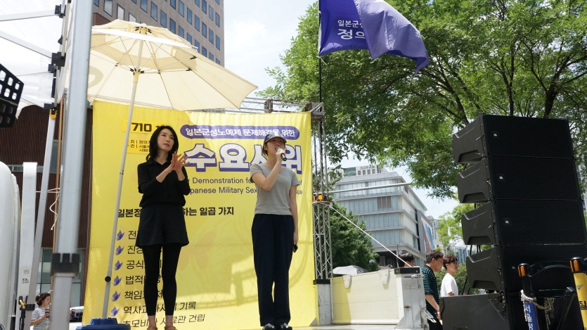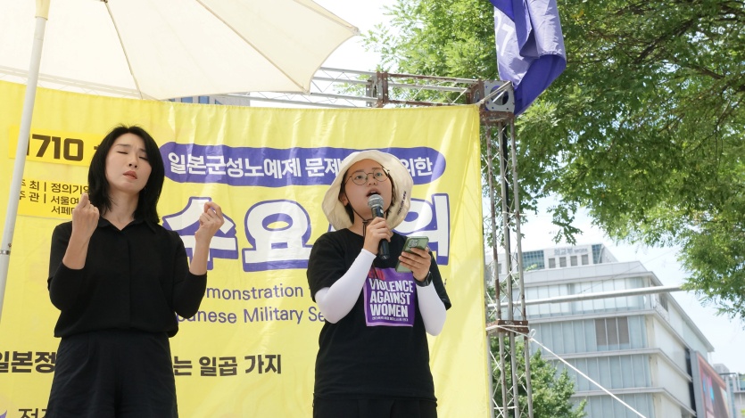 안녕하십니까. 서울여성회 페미니스트 대학생 연합동아리 서페대연 활동가 전수진입니다. 저는 대학생 페미니스트로서 일본군 성노예제에 대한 사죄와 여성 폭력 해결을 촉구하기 위해 이곳에 있습니다.