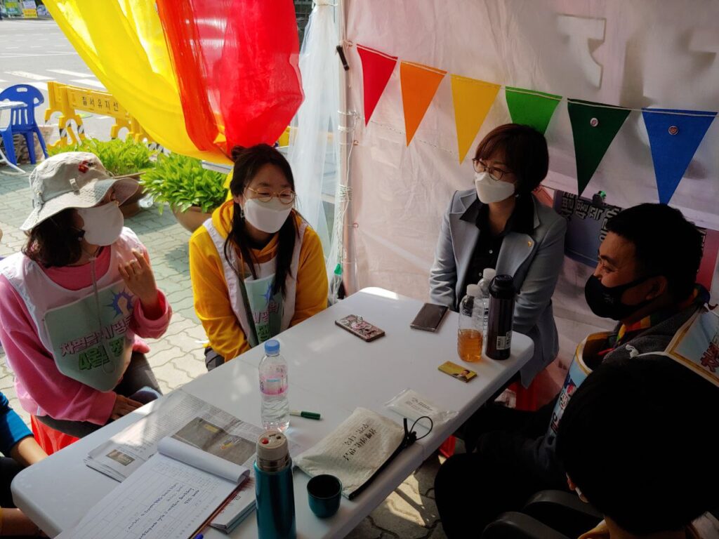 먼저 단식자들을 만나 인사를 나누고 연대의 마음을 전했습니다. 매주 수요시위 현장에서 벌어지는 혐오의 목소리를 듣고 있는데 여기 국회 앞 평등텐트촌 주변으로도 같은 목소리가 울려퍼지고 있어 더욱 서로를 위로하고 함께 투쟁할 힘을 나눴습니다.