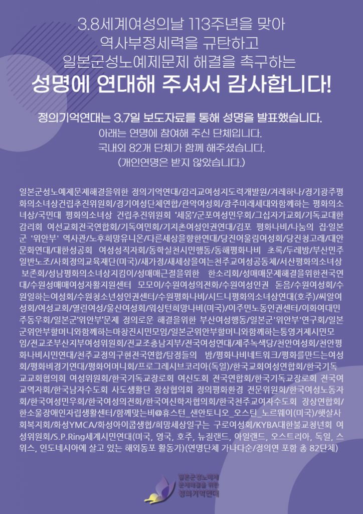 3.8 세계여성의 날 113주년을 맞아 일본정부의 책임을 묻고, 성폭력을 정당화하는 역사부정 세력을 규탄하며, 젠더정의의 이름으로 피해자들의 명예 회복과 일본군성노예제 문제의 올바른 해결을 위한 연대성명에 국내외 82단체가 함께 해주셨습니다. 감사합니다.
