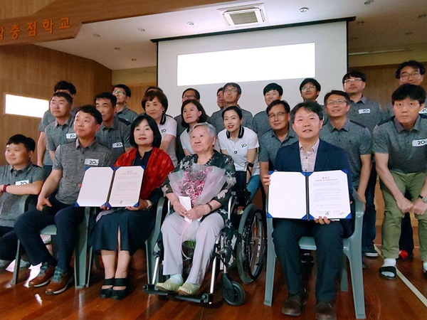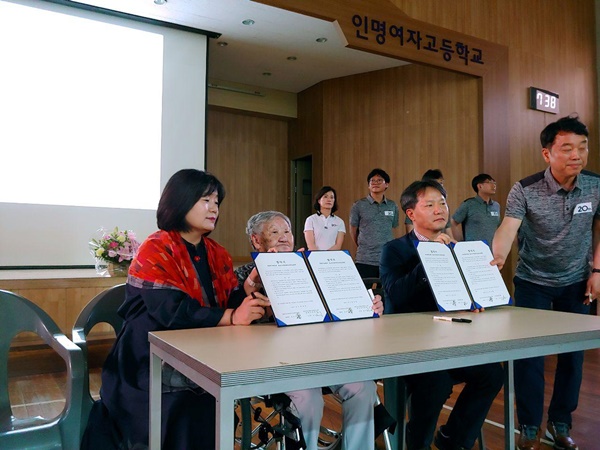 행사는 총 4부로 구성되어 있고, 그 중 제 4부 다짐 실천 시간에 전교조인명여자고등학교분회 분회장 송남규 그리고 일본군성노예제 문제해결을 위한 정의기억연대 이사장 윤미향이 협약서(NOU)를 체결하였습니다.