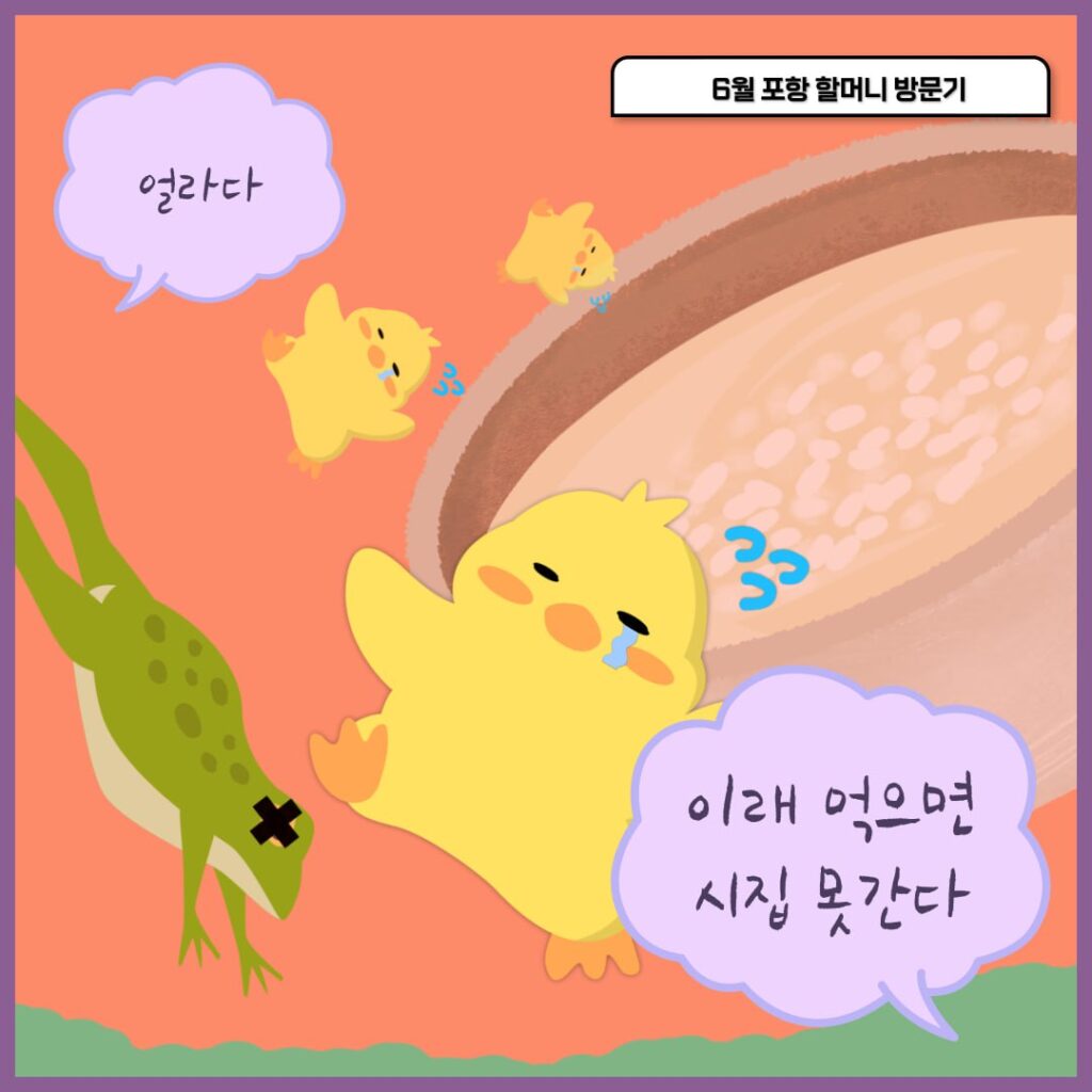 6월 26일, 행, 방학, 도담 활동가가 포항에 계시는 할머니를 방문했습니다. 할머니를 조금 더 일찍 뵙고 이야기 나누고 싶은 마음에 이른 아침부터 포항으로 향했습니다. 할머니께서는 처음 방문한 도담 활동가를 보시더니 “이 처자는 낯설다.” 라고 하시며 몇 살인지, 시집은 갔는지 이것저것 물으셨습니다.