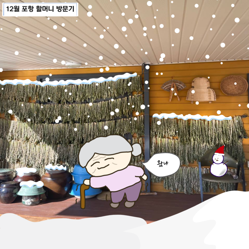 열무, 행, 결 활동가가 포항에 계신 박필근 할머니댁에 방문했습니다. 할머니댁 도착하자마자 가지런히 걸려있는 시래기가 우리 마음을 푸근하게 만듭니다. 추운데 멀리서 오느라 고생했다며 인사해주셨습니다. 이 날은 유난히 추운 날이었는데요. 할머니 댁은 따뜻해서 다행이었답니다.