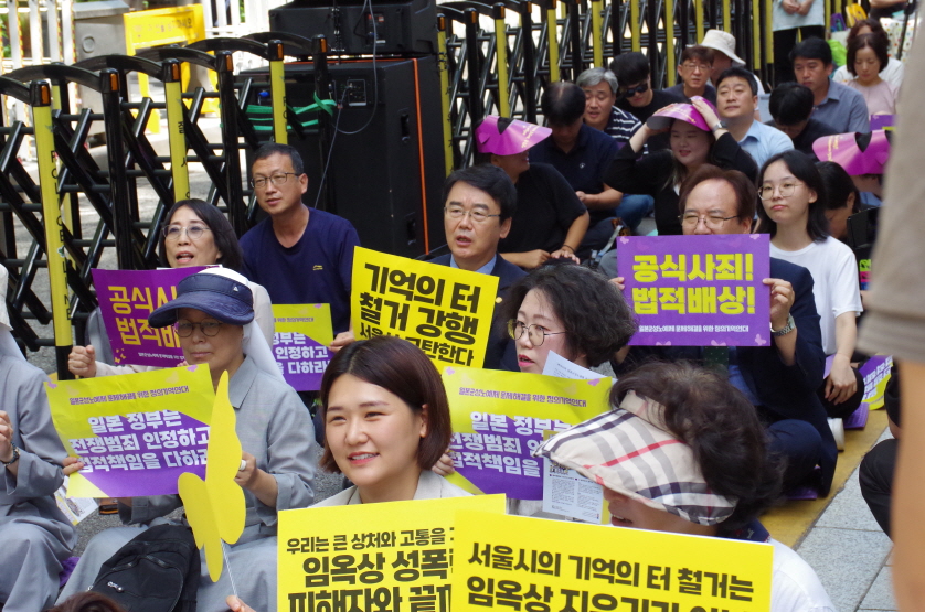 서울시가 밝힌 철거 이유는 조각을 제작한 임 씨가 최근 성폭력으로 형을 선고받았기 때문이라고 합니다. 물론 이 이유에 공감하지 않는 것은 아닙니다. 성범죄는 처벌받아야 마땅하며, 이에 대해서는 의심의 여지가 없다고 생각합니다. 따라서 성범죄자의 조각상을 철거해야 한다는 주장 자체에 반대하는 것이 아닙니다. 그러나, 우리는 서울시가 숨기고 있는 의중을 묻지 않을 수 없습니다. 서울시는 임 씨의 작업물을 몰아낸 후 어떤 작품으로 그 자리를 대체할지 명확히 밝힌 바 있습니까? 일본군 ‘위안부’ 역사를 지우려는 의도가 정말 티끌만큼도 없었다고 당당히 말할 수 있습니까? 서울시는 관계자들의 의견을 듣겠다고 말했음에도 이를 지키지 않고, 구체적인 계획조차 없이 무작정 철거부터 강행했습니다. 이는 기억의 터 건립까지 의지와 용기로 함께해주신 할머님들과, ‘세상의 배꼽’에 그림을 그려주신 윤석남 작가님, 그리고 조각 건립을 위해 마음을 모아 준 2만여명의 시민분들까지, 그 모두를 지우는 행위입니다.