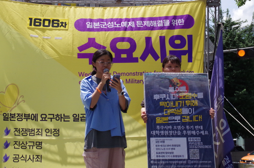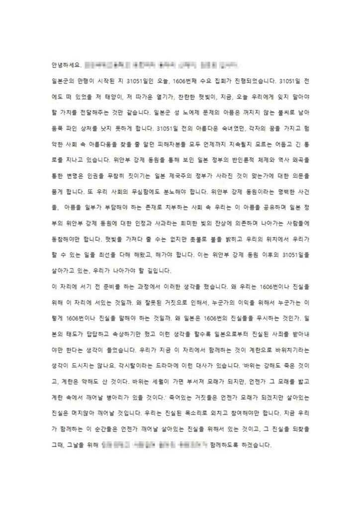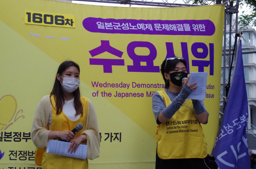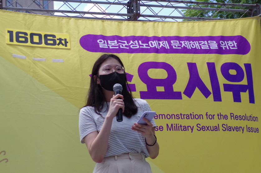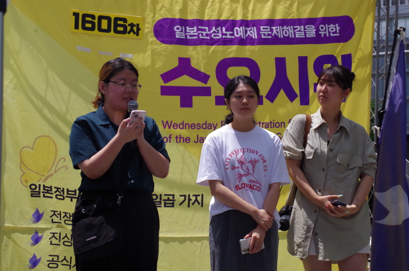 오늘 1606차 수요 집회를 맞아 저는 이 자리에 섰습니다. 지금 이 자리에 선 저는 1606차에 맞는 긴 시간 동안 이 자리를 지켜주신 분들께 감사함을, 지금까지 무심해 왔던 자신에게 부끄러움을, 목소리를 외친지 긴 시간이 지난 지금까지도 변함없는 현실에 분노와 슬픔을 느낍니다. 오늘 여기에서의 발언이 누군가에게는 위로가 되기를, 잘못됨을 고치고 부당한 현실을 바꾸는 원동력이 되기를 바랍니다.