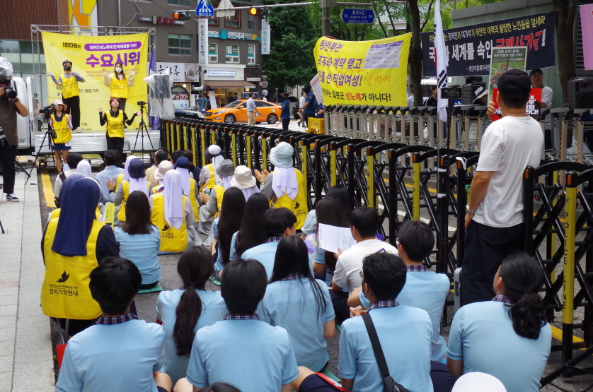 안녕하세요 저는 정의연에서 주관하는 ‘전쟁과 여성인권 박물관 기자단 2기‘ 중 A팀에 속해있는 정윤지라고 합니다. 오늘 수요시위에 참여하게 되어 기쁘고 이런 더운 날씨에도 시위하는 모습들을 보고 많이 배워갑니다.