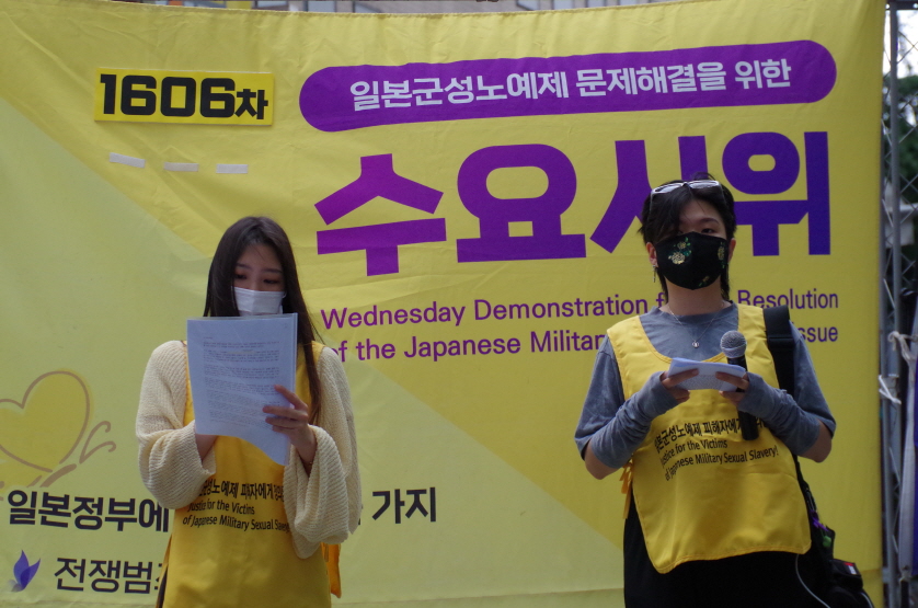 일본군 ‘위안부’는 과거 일본군이 식민지 여성들을 동원해 성노예로 만든 전쟁범죄입니다. 해당 범죄는 많은 이들에게 아픔을 주었고 지워지지 않는 상처를 남겼습니다. 이에 우리는 이렇게 나서 목소리를 내고 있습니다. 그러나 그들은 이 수요 집회가 1606차가 되도록 답하지 않고 있습니다. 우리가 바라는 것은 많은 것이 아닙니다. 그저 과거 잘못에 대한 인정과 피해자에 대한 진실된 사과입니다. 국가의 이미지를 위해 자신의 치부를 숨기며 최소한의 인간으로서 도리조차 져버린 이 현실이 개탄스러울 뿐입니다.