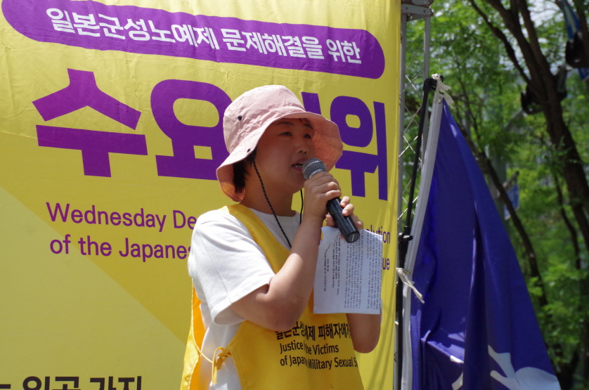 수요시위에 참여한 경험은 지난 한 해 동안 제 삶을 많이 바꿔놓았습니다. 실제로 현재 저는 일제의 전쟁범죄 사실을 인정하지 않는 뒤틀린 역사관을 가진 이들에게 당당히 사과를 요구할 수 있는 고등학생이 되었습니다. 그러나 작년의 수요시위로부터 1년이란 시간이 흐른 지금, 일본군성노예제 문제 해결에 대한 일본 정부의 태도에 약간의 변화조차 없다는 사실은 제 가슴을 아프게 합니다.