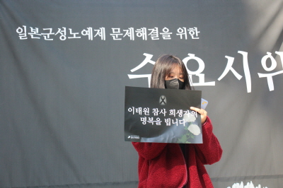언제부터인가 저에게는 너무 가까운 문제가 되어버린 일본군성노예제 문제와 수요시위를 지키는 일이 누군가에게는 아직 잘 모르는 일일 수 있다는 것에 놀라는 한편, 더 많은 사람들, 대학생과 함께하기 위해 더 말하고 더 움직이고 더 싸워야겠다고 생각했습니다.