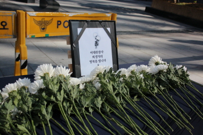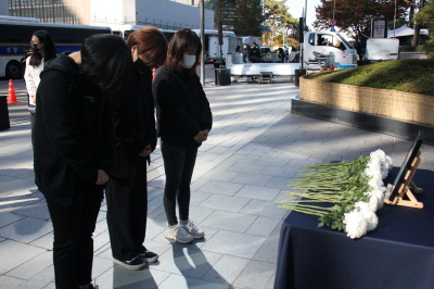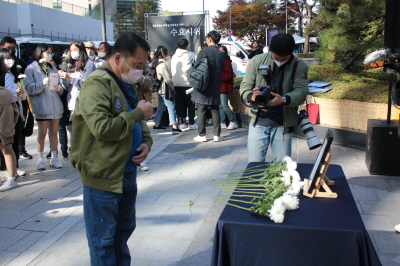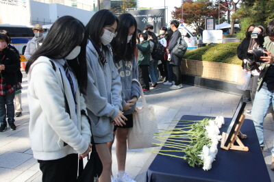그리고 참가자들과 활동가들은 수요시위장에 작게 마련한 이태원 참사 희생자들을 위한 영정에 헌화하며 추모하였습니다.