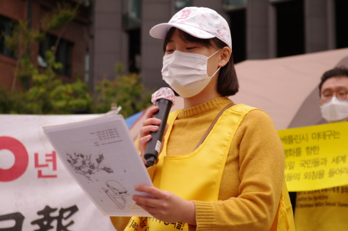 그럼 이만 부족한 글을 대신 읽어주신 관계자 분, 현장에 계신 정의연 활동가 분들과 온라인으로 함꼐해주시는 여러분꼐 감사드리며 마지막 구호를 외치고 물러가겠습니다.