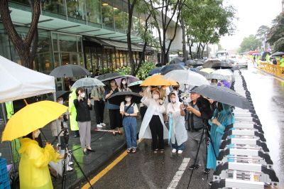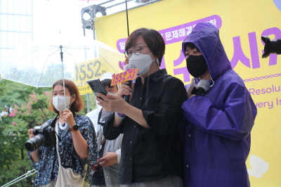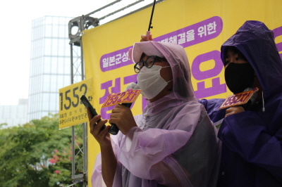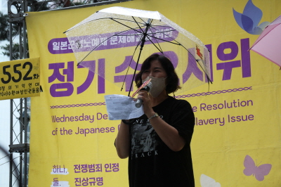 안녕하세요. 수원여성인권돋음의 활동가 황지입니다. 무더운 여름날 어김없이 수요집회가 이어지고 있습니다. 오늘은 1552차 수요집회입니다. 1552번의 집회를 이어나가는 30년이라는 긴 시간 동안 여전히 일본 정부는 그들의 입장을 바꾸지 않고 있습니다. 전쟁 범죄에 대한 역사적 사실을 인정하지 않고 일본군성노예제 피해자들에게 진정성있는 사죄가 이루어지지 않는 한 전쟁은 끝나지 않은 것입니다. 그들은 언젠가 시간이 지나면 일본군성노예제 피해자들이 사라질 것이라고 생각합니다. 그들의 범죄와 피해자의 증언들이 기억에서 잊혀질 것이라고 생각합니다. 그러나 그들이 역사적 진실을 마주하지 않는 긴 시간 동안 우리들의 기억은 더욱 더 널리 퍼지고 더욱 더 단단해지고 있습니다. 모진 추위와 찌는 더위 속에서 많은 사람들이 오늘도 기억을 이어 나가고 있습니다. 지금 이 자리에 함께하는 우리 모두가 목격자이며 증언자로 남을 것입니다. 일본 정부는 더 이상 그들의 과오를 다음 세대에게 대물림하지 마십시오. 아직 전쟁은 끝나지 않았습니다. 일본 정부는 하루빨리 역사를 인정하고, 전쟁 범죄에 대하여 사죄하며, 피해자들에게 합당한 배상을 하십시오. 이 기나긴 전쟁을 종식시키기 위하여 행동할 것을 강력히 촉구합니다.