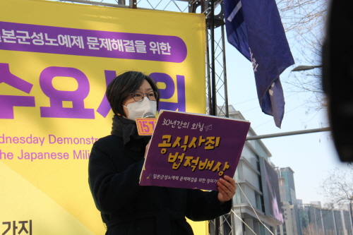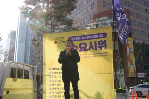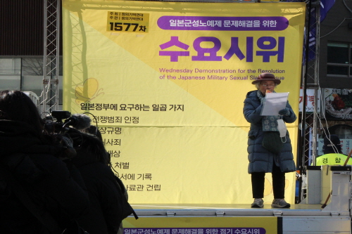 그렇게 뜨거운 열정과 용기를 품고 이 자리를 지켜온 지 31년이라니 만감이 교차하는 순간입니다. 내 나이 50대 중반에 첫 수요시위를 시작하여 이제 90을 바라보는 초고령 노인이 되었습니다. 지금쯤 평화로운 마음으로 위태위태한 내 노년을 가꾸기에나 전념할 나입니다. 지팡이 짚고 뒤뚱거리며 또 다시 이 수요시위에 나와 여러분들을 만나야 한다니 가슴이 쓰리고 참담합니다. 일본군위안부 피해자 명예회복을 외치는 세계 양심세력들의 투쟁에 귀 막고 역사왜곡에 혈안인 일본은 물론 국내의 친일 극우세력의 준동 앞에서 억장이 무너집니다. 31년도 모자라 앞으로 얼마나 더 오래 우리 젊은이들의 아까운 청춘 에너지를 이 차가운 시멘트 바닥에 쏟아야 한단 말입니까. 분하고 원통합니다.