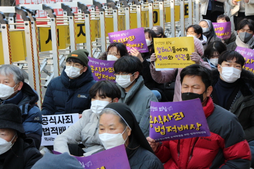 수도자가 기도나 하지 왜 이런자리까지 나왔냐고 하시는데요, 수도자이니까 나올 수밖에 없었습니다. 참된 기도는 가장 아픈 자리에서 하는 것이기 때문입니다. 할머니들의 외침, 그리고 이 어린 학생들이 할머니들의 눈물을 기억하며 함께 외치는 이 자리가 바로 성전입니다. 저희 수도자들이 모두 다 함께 여기 이 자리에 나올 수는 없지만, 모두 같은 마음으로 기도하고 있습니다. 저희 수도자들은 앞으로도 할머니들과 또 31년째 이 자리를 지켜주신 정의연과 또한 여러분과 함께 기도안에서 지켜갈 것입니다.