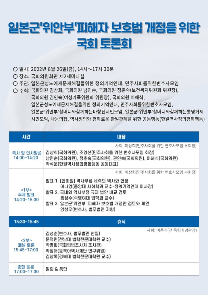 일본군성노예제 문제해결을 위한 정의기억연대는 피해자에 대한 공격과 일본군‘위안부’ 역사 부정이 ‘표현의 자유,’ ‘집회의 자유’라는 이름으로 확대·재생산되는 상황을 매우 심각하게 여겨, 민주사회를위한변호사모임과 공동주관으로 8월 26일(금) 오후 2시 국회의원회관 제2세미나실에서 ‘일본군’위안부’피해자보호법’ 개정 검토를 위한 국회 토론회를 개최하였습니다.