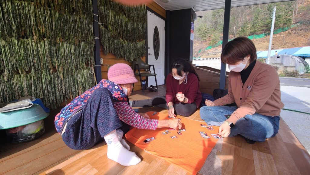 할머니 댁으로 돌아와 이런저런 이야기를 나누던 중, 할머니는 민화투를 꺼내셨습니다. 고스톱은 쳐봤지만, 민화투는 쳐 본 적 없는 새싹 활동가는 조금 긴장했습니다. 그런데 할머니께서는 새싹 활동가에게 ‘잘 친다~’고 해주셨습니다. 화투에 관해서는 칭찬에 인색하신 할머니께서 칭찬해주셔서 무척 기뻤습니다. 대여섯 판을 했지만, 행 활동가와 새싹 활동가는 한 판을 빼고는 할머니를 이길 수 없었습니다! 할머니께서는 계속 ‘해 떨어지기 전에 얼른 가라’고 하시면서도 ‘한 판 더 놀자’고 하셨습니다. ‘서울 가면 어둡겠다’고 계속 걱정하시면서도 다음 판을 권하시는 할머니의 모습을 보고 자주 뵙고 싶다는 마음이 들었습니다.