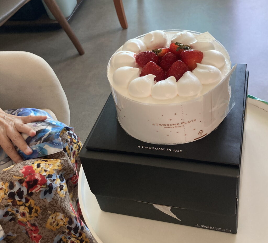 같이 촛불을 끄고 케이크를 나눠 함께 먹었습니다. 할머니도 부드러운 케이크가 맛이 좋은지 잘 잡수십니다.