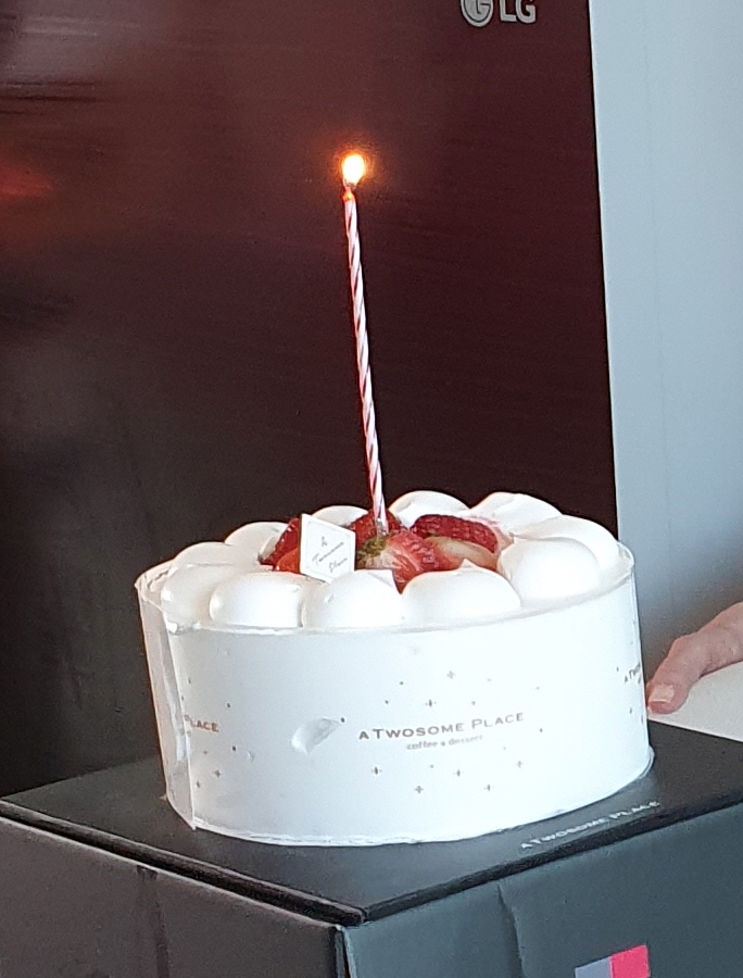 케이크에 초 하나만 꽂았습니다. 할머니 연세만큼 초를 준비해 갔지만 할머니 몇 개 꽂을까요? 여쭤보고 하나만 꽂기로 했습니다. 노래 부를게요~ 하니 손을 저으시지만 생신 축하합니다~ 노래를 부르자 웃으며 기다리십니다. 사랑하는 할머니 생신 축하합니다! 하고 초 부시라고 기다리지만 할머니는 초를 불 생각은 없으신 듯 계속 빙그레 웃기만 하십니다.