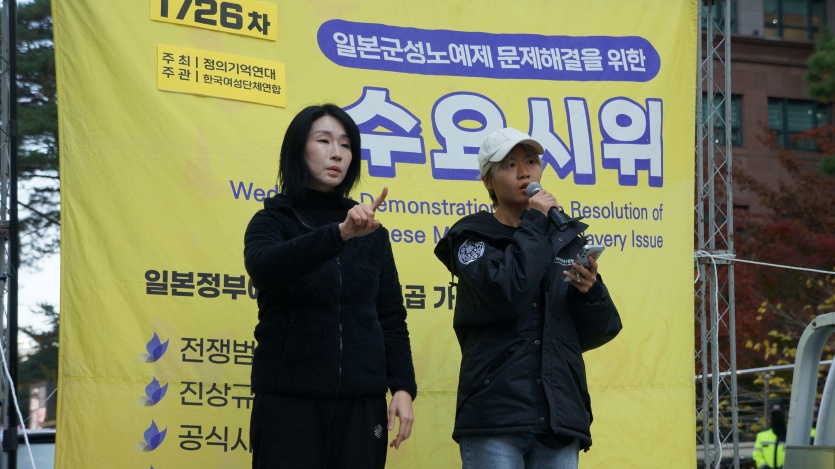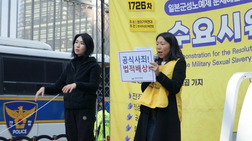 1726차 일본군성노예제 문제해결을 위한 정기 수요시위의 주관은 한국여성단체연합에서 하였고 사회는 김태윤 한국여성단체연합 활동가님이 보았습니다.