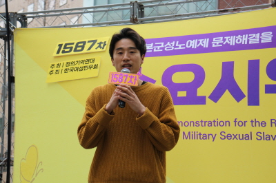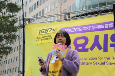 1587차 일본군성노예제 문제해결을 위한 수요시위 주관은 (사)한국여성민우회가 하였고, 사회는 보라 활동가님이 보았습니다.