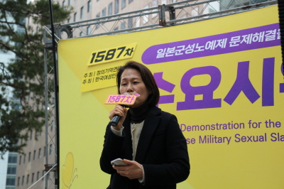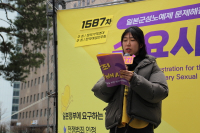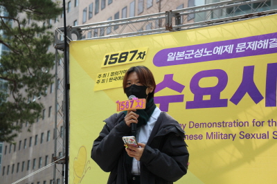 1587번의 수요시위가 계속되는 동안 우리는 서로의 가장 큰 힘이 되어 주었습니다. 그동안 어려운 일도 많았지만 연대의 힘으로 묵묵히 버텨내며 이 자리까지 올 수 있었습니다. 하지만 일본 정부는 여전히 일본군 성노예제의 존재를 부인하고 있으며, 한국 정부 역시 가해자의 시선으로 친일굴욕외교를 펼치며 역사적 진실을 회피하려 하고 있습니다. 우리는 도대체 언제쯤 일본 정부의 사죄를 받을 수 있을까요. 우리는 도대체 언제쯤 수요시위를 멈출 수 있을까요.