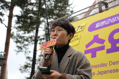 안녕하세요. 저는 한국여성민우회 성폭력상담소 활동가 민초입니다. 수 년 간 수요시위를 지켜만 보다가 처음으로 이렇게 직접 발언할 수 있게 되어 영광으로 생각합니다. 하지만 한편으로는, 이렇게 오랜 시간 수요시위가 이어지는 동안 아직도 일본군 성노예제 문제는 여전히 해결되고 있지 않다는 사실이 저를 슬프게 합니다.