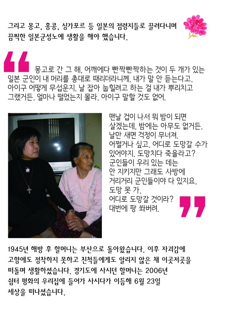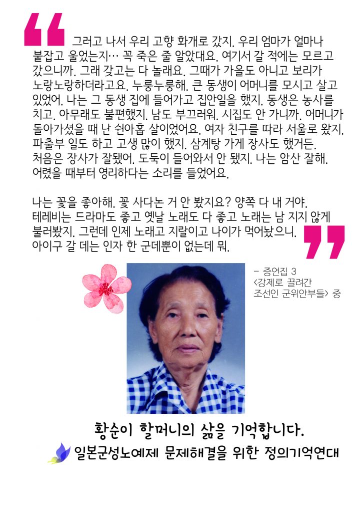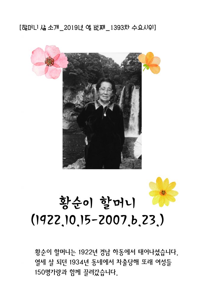 2007년 6월 23일 돌아가신 황순이 할머니의 삶 소개 후 평화나비네트워크의 여는 노래 <바위처럼> 율동에 맞춰 신나게 수요시위를 시작하였습니다.
