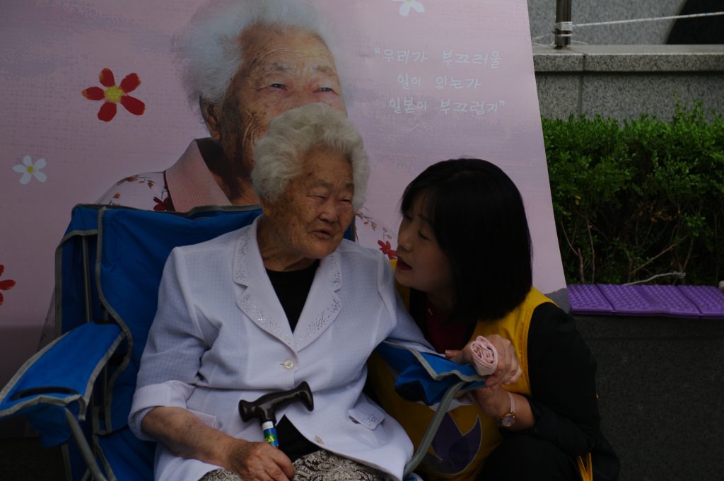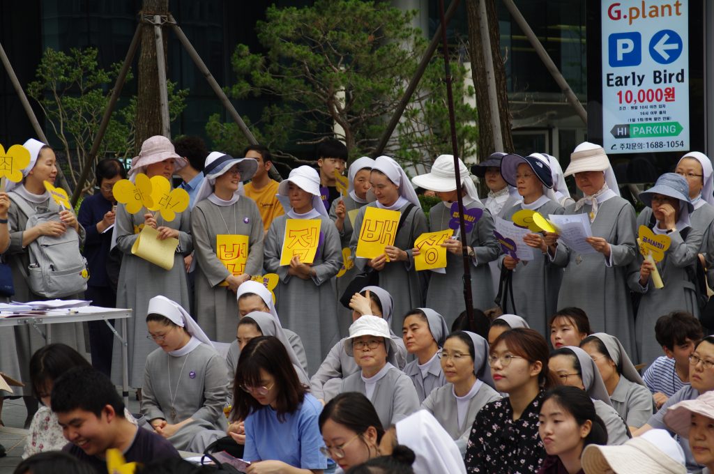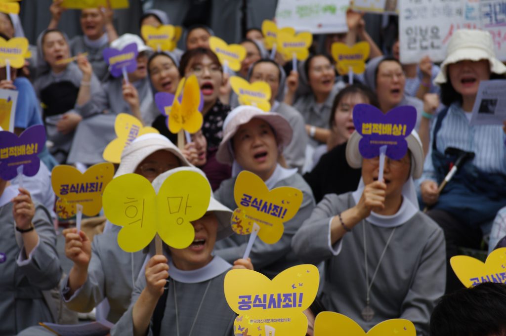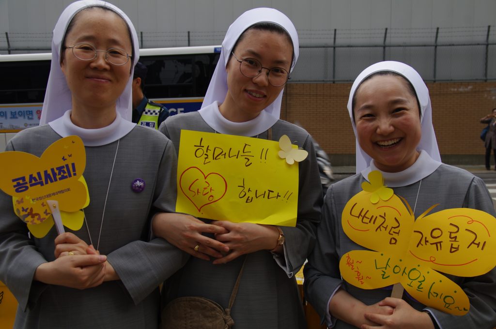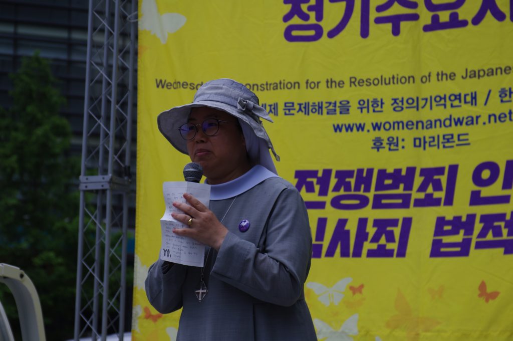 올리베따노성베네틱토수녀회의 노래 공연 후 참가단체 소개와 자유발언 시간이 이어졌습니다. 올리베따노수녀회 이노렌조 수녀님, 밀알두레학교 박정식 선생님, 평화나비네트워크 새내기 백휘선 학생이 할머니들과 함께 일본군성노예제를 정의롭게 해결하기 위해 함께하겠다고 발언하였습니다.