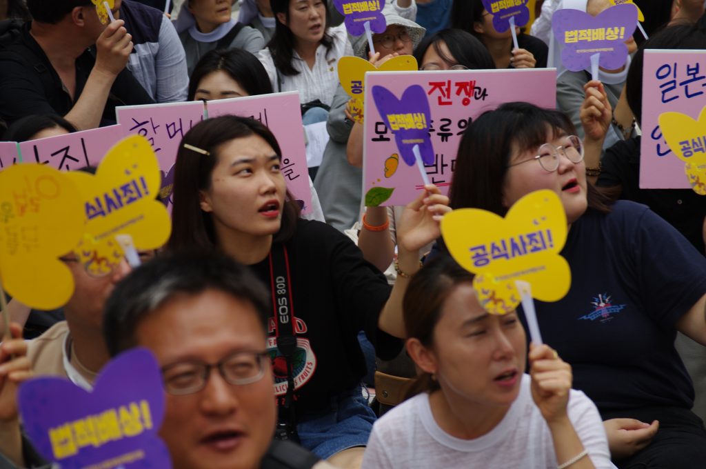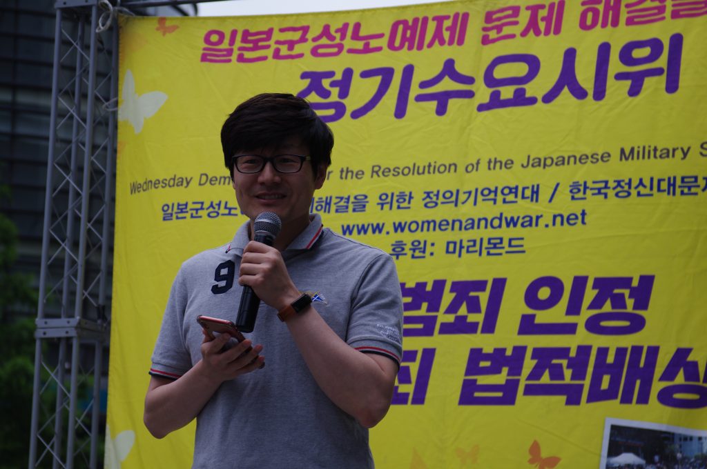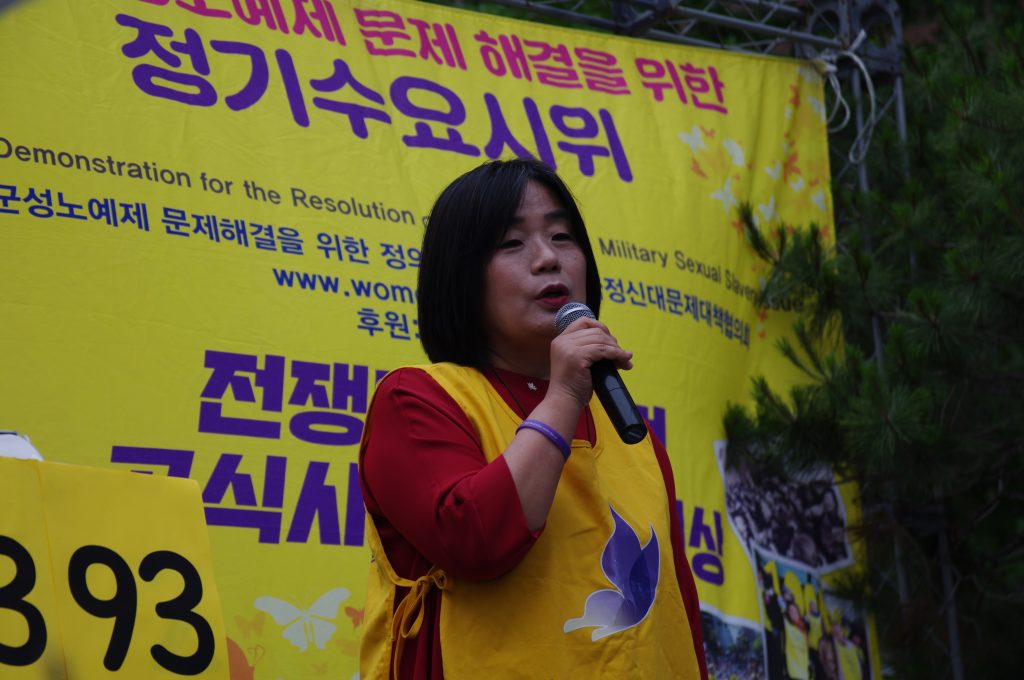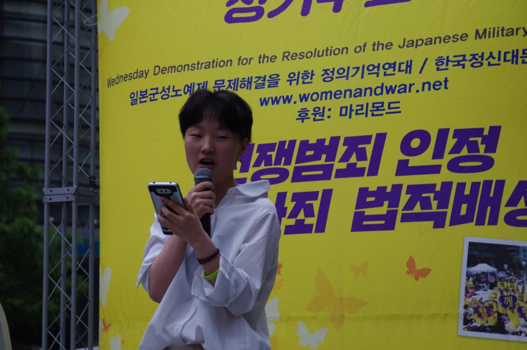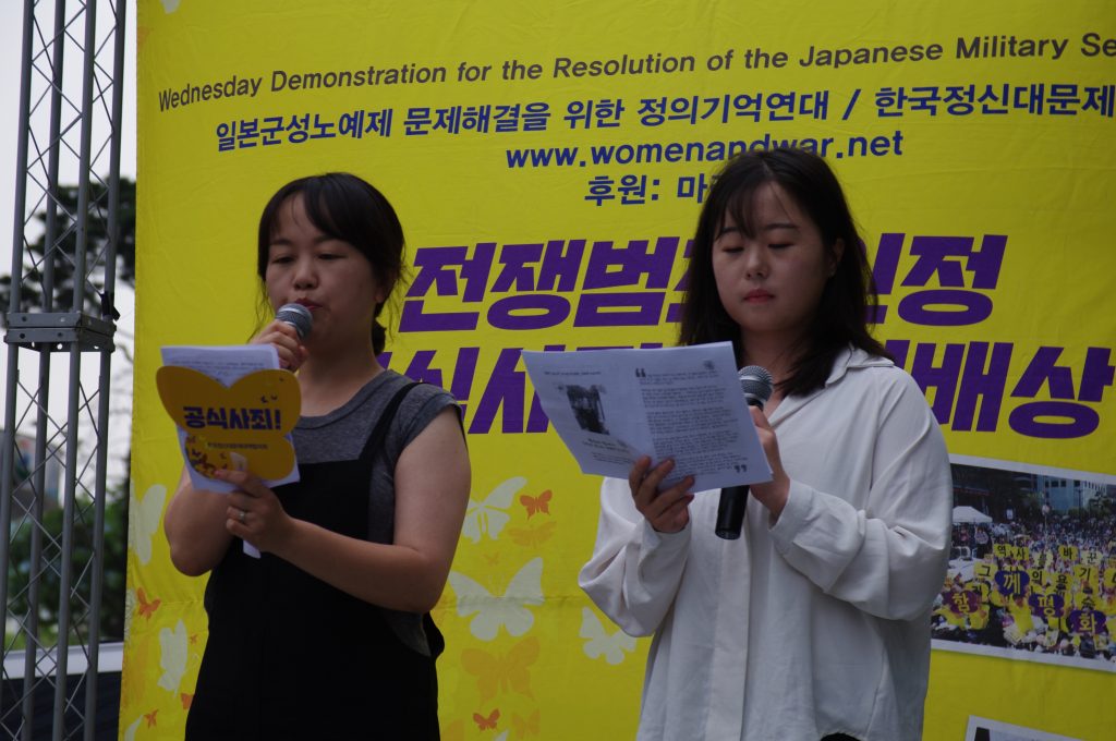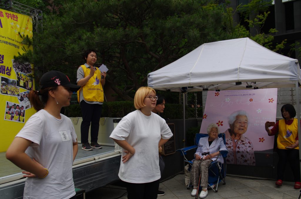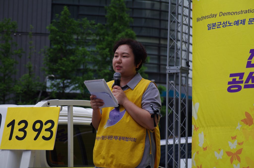 정의기언연대 윤미향 대표는 경과보고에서 8월 14일 1400차 수요시위 그리고 7차 세계일본군‘위안부’ 기림일을 소개하며 청소년, 시민들, 그리고 국내 곳곳, 해외 곳곳에서 많은 사람들이 함께할 것이고 더욱 멀리 울려 퍼지도록 하자 외쳤습니다. 그리고 이옥선 할머니를 비롯한 여러 할머니들께서 나오시는 영화 <에움길>이 지금 개봉하여 상영하고 있고, 8월 8일에는 영화 <김복동>이 개봉할 예정임을 알렸습니다. 할머니들의 삶과 말씀을 기억하고 할머니들이 외쳤던 목소리를 우리가 함께하기 위해 영화도 열심히 많이 보자 요청하였습니다. 또 7월 13일이 일본군성노예제 문제해결을 위해 일본에서 오랫동안 활동하고 있는 시민단체 간사이네트워크 10주년이며 그때 길원옥 할머니와 김복동 할머니의 말씀에 따라 재일조선학교 아이들을 지원하기 위해 만들어진 <김복동의 희망>이 함께 오사카에 가서 일본 시민들과 재일조선학교 학생들과 함께 길원옥 할머니가 나오신 영화 <어폴로지>를 함께 보고 가수 길원옥 할머니의 ‘길원옥의 평화’ 콘서트도 할 것임을 알렸습니다.