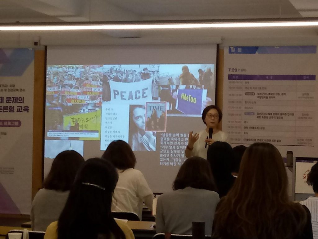 30일 오전에는 중앙대학교 사회학과 이나영 교수의 주제특강 <페미니즘 관점에서 본 한국의 일본군‘위안부’ 운동>을 들었습니다. 오후에는 토론형 교육을 위한 진행법과 논제 발제법 강연 후 김복동 할머니 증언소설을 주제로 토론논제 발제실습 시간을 갖고 마지막으로 전쟁과여성인권박물관 관람을 했습니다.