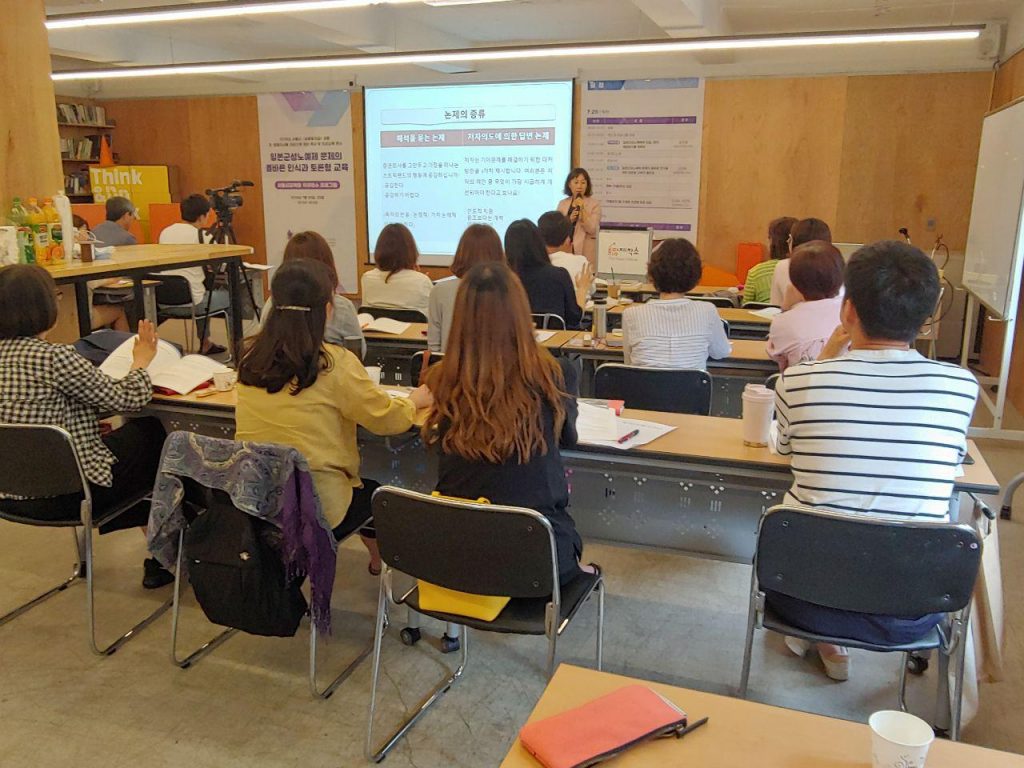 서울 지역 초, 중, 고등학교 선생님들을 대상으로 일본군성노예제 문제와 평화, 인권에 대해 알고 비경쟁 토론 이론과 실습을 해보는 시간이었습니다. 서울시교육청 교사 직무연수로 진행된 이번 연수에는 평소 일본군성노예제 문제와 인권, 평화에 대해 학생들이 어떻게 알게 할지 열심히 고민하시는 선생님들이 모인 만큼 진지하고 활발한 강연과 토론수업이 이어졌습니다.