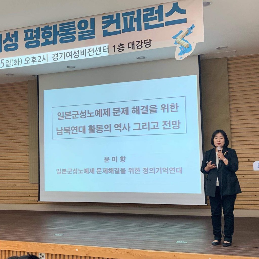정의기억연대 윤미향 대표는 일본군 ‘위안부’ 문제의 중요성을 ▲과거사 청산 ▲인권 ▲평화 ▲통일 등의 차원에서 설명했습니다. 특히 ‘남북 일본군 성노예제 피해자들의 연대활동’을 소개하며, “연행 당시 북이 고향인 피해자들의 ‘이산’의 아픔은 또 다른 과제이다”라고 말했습니다. 윤 대표는 “남북 일본군 성노예제 피해자들의 연대활동으로 분단은 제거되고 있었고 이미 통일은 와 있었다”며 “감동 그 자체였다”, “길원옥 할머니의 고향은 평양이다. 평양 주소나 지도를 생생히 기억하고 계시다”라며 “할머니들은 30여 년 동안 남북 평화의 길을 열어왔다. 할머니들이 집으로 가는 길을 어떻게 열 것인가는 우리 후배들이, 통일활동가들이 완성시켜야 한다”고 강조했습니다.