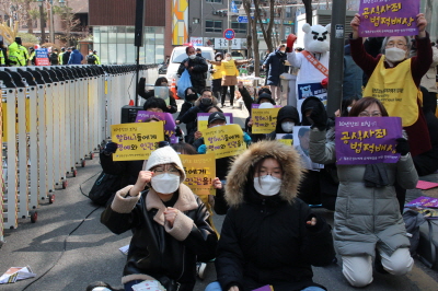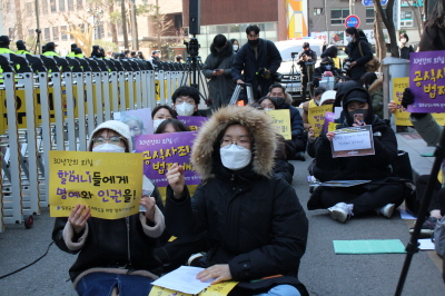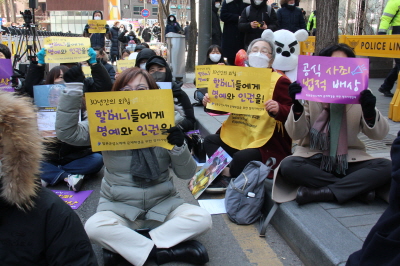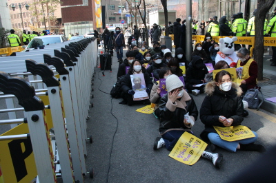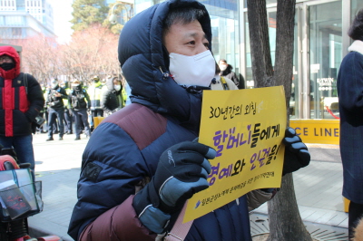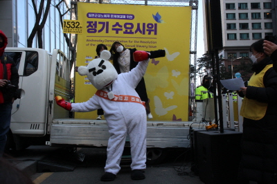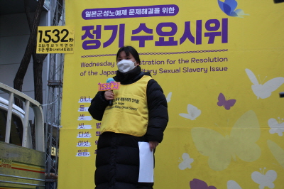 안녕하세요, 평화나비 네트워크 이담비 입니다. 벌써 2월의 마지막 수요시위네요. 오늘 날씨가 정말 추운데 함께 해주신 여러분들께 감사의 인사 하면서 시작하도록 하겠습니다. (박수)