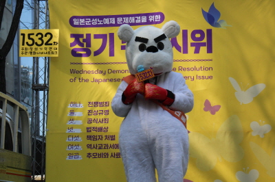 그리고 연대발언이 이어졌습니다. 곽정민(서울여대 슈터플라이 지부 대표), 백건하(경기 평화나비 대표), 이담비(평화나비 중앙집행부), 이은영(평화나비 중앙집행부), 허수경(평화나비 전국대표), 20대 대선 청년 가상 후보 박곰(2022 대선대응 청년행동) 님이 연대발언을 하였습니다. 20대 대선 청년 가상 후보 박곰 님은 20대를 대표하여 20들이 하고픈 말을 전하고 있는 백곰 모습의 후보였고 1532차 수요시위에 참가하여 발언을 하였습니다.