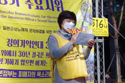 마지막으로 기독교대한감리회 여선교회전국연합회 김재흥 회계님의 성명서 낭독을 끝으로 1516차 일본군성노예제 문제해결을 위한 수요시위는 마무리되었습니다.