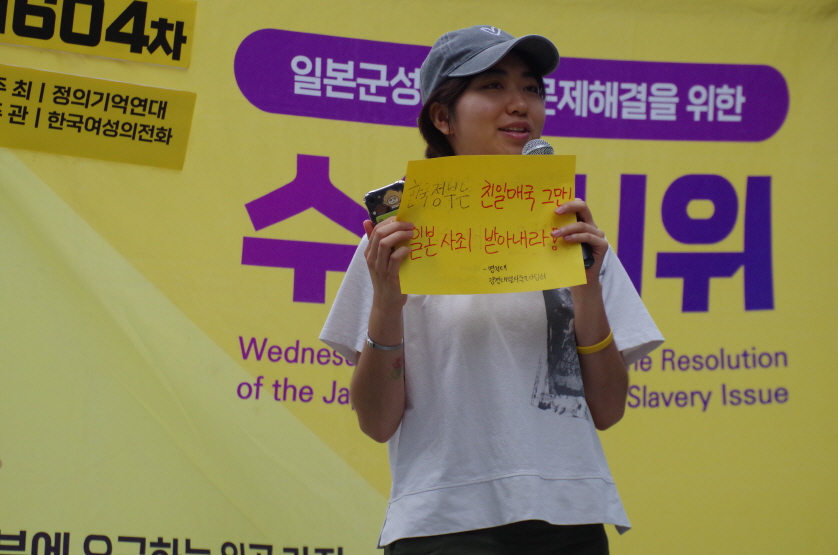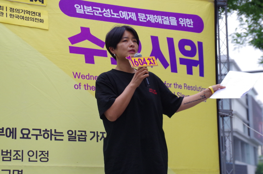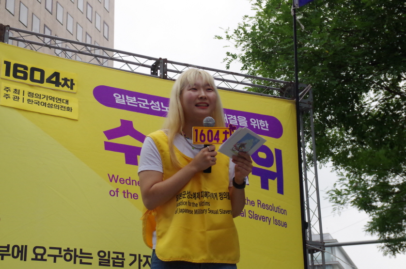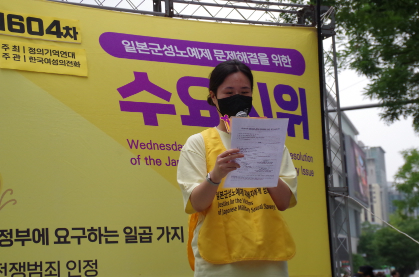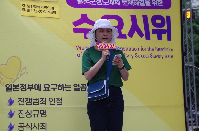 1604차 일본군성노예제 문제해결을 위한 수요시위의 주관은 한국여성의전화가 하였고, 사회는 활동가 지나 님이 보았습니다.
