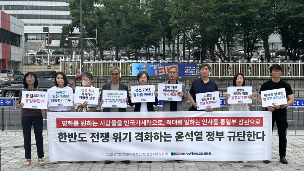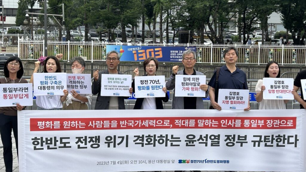 지난 6월 28일 윤석열 대통령은 자유총연맹 창립 기념식에서 종전선언, 대북 제재 완화를 주장하는 사람들을 ‘반국가세력’으로 매도하고, 종전선언 추진을 ‘가짜 평화’로 규정하였다. 이어 29일에는 남북 합의를 부정하고 ‘김정은 정권 타도’, ‘북한 체제 파괴’, ‘남한 핵무장’ 등을 주장해 온 극우 인사 김영호 성신여대 교수를 통일부 장관으로 지명하였다. 7월 2일에는 “그동안 통일부가 ‘대북 지원부’와 같은 역할을 해왔는데 그래서는 안 된다”며 대화, 교류, 협력이라는 통일부의 기본 업무를 사실상 부정하는 발언을 이어갔다. 관련하여 통일부 대변인은 앞으로 통일부가 ‘북한 비핵화와 인권 증진’ 등에 주력할 것이라고 밝혔다. 일련의 발언과 인사를 통해 정부는 앞으로 대북 적대, 압박 정책을 전면화할 것을 분명히 하고 있다. 총체적 난국이다.