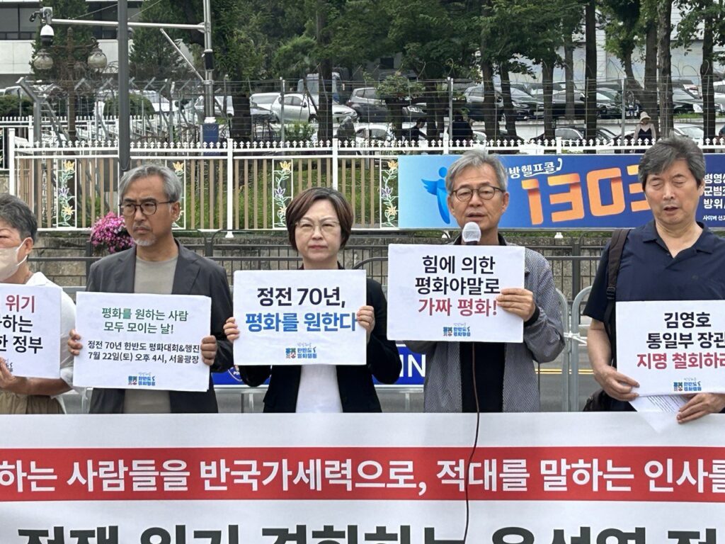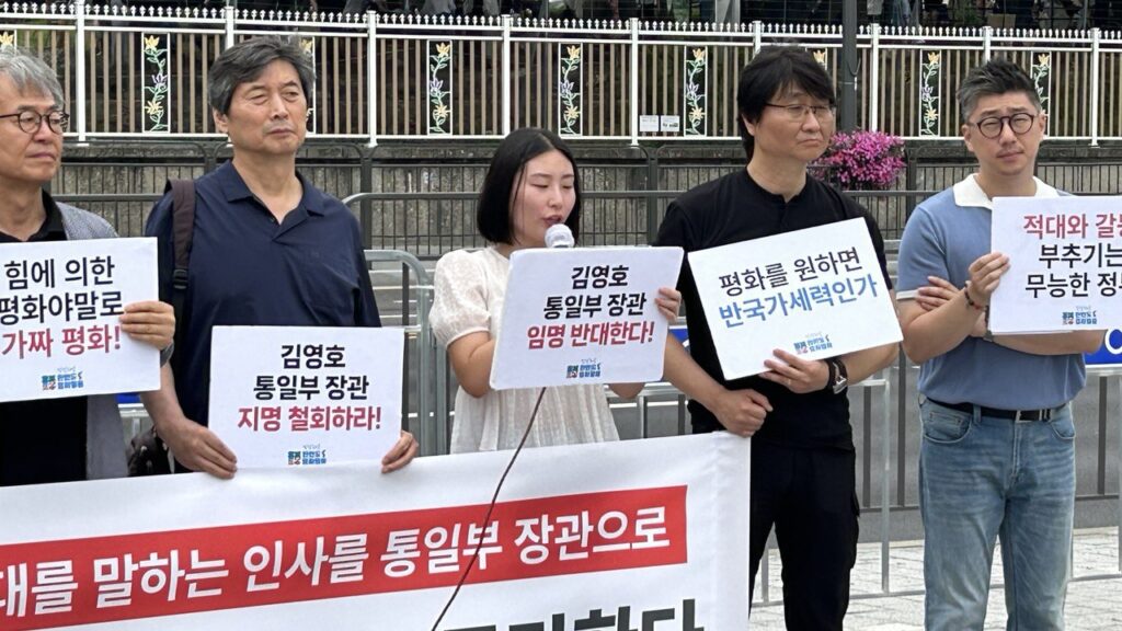 더불어 기자회견 참여자들은 대북 적대로 일관해 온 인물, 북한 정권 붕괴 등의 주장을 이어온 흡수통일론자인 김영호 교수를 통일부 장관으로 지명한 것을 강력하게 비판했습니다. 대통령이 통일부가 대북 압박에 집중할 것을 공개적으로 주문한 것은 “지난 수십 년 동안 상호 체제의 차이를 존중하고 교류, 협력하며 평화적 방식으로 통일하자고 지속적으로 약속해 온 남북 합의들의 근간을 무너뜨리는 조치”라고 지적하며, “남북 대화, 교류·협력을 담당하는 통일부 고유의 역할을 완전히 부정하고 ‘평화적 통일’을 규정한 헌법 정신을 훼손하는 조치는 당장 철회되어야 한다”고 강조했습니다.