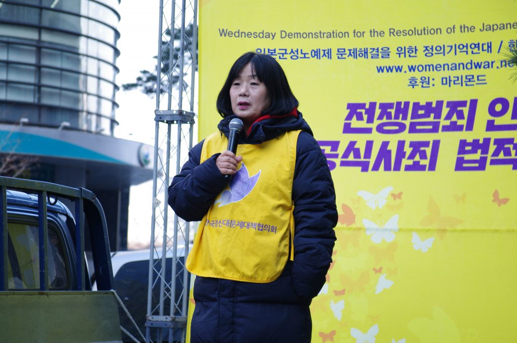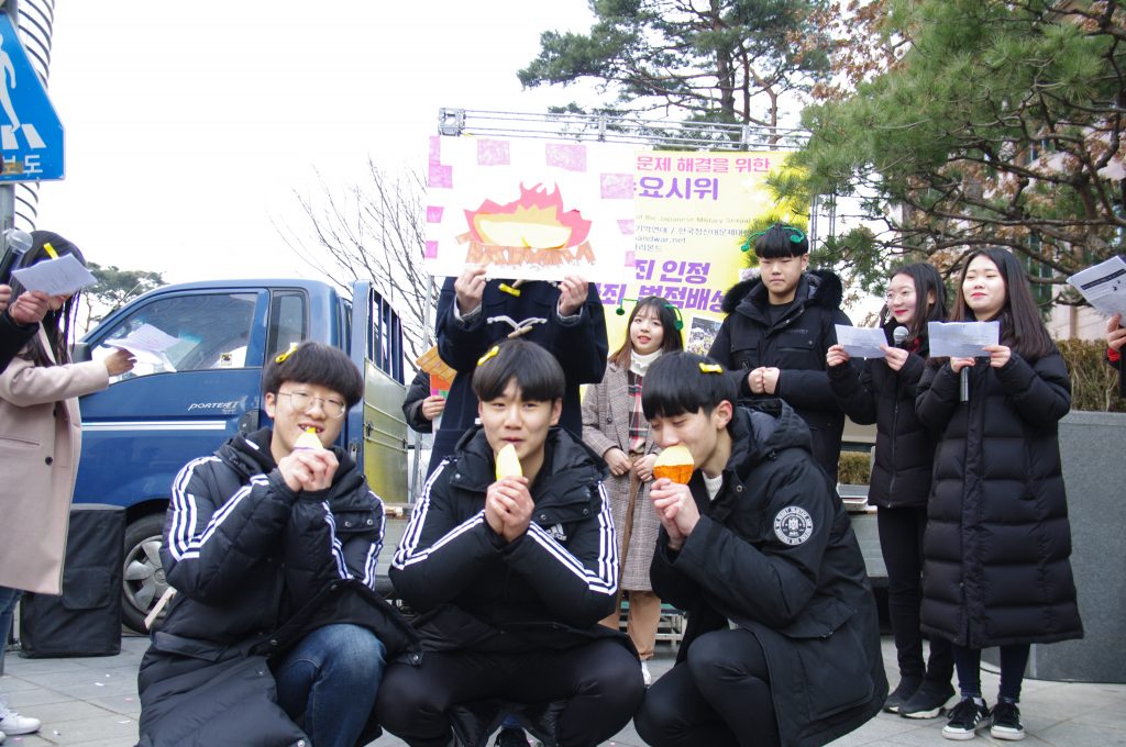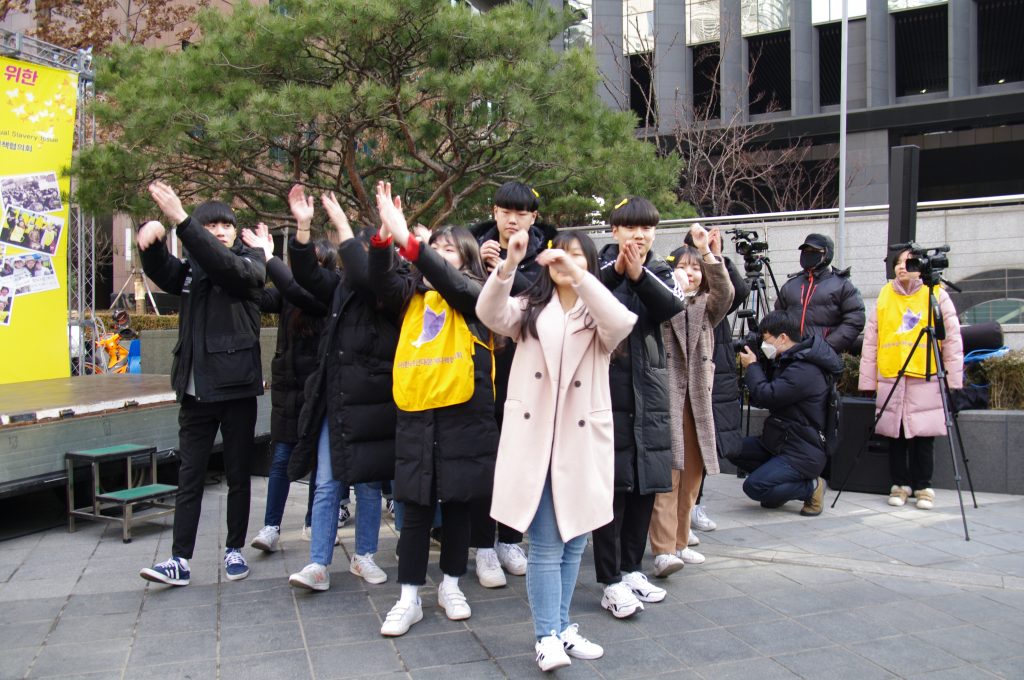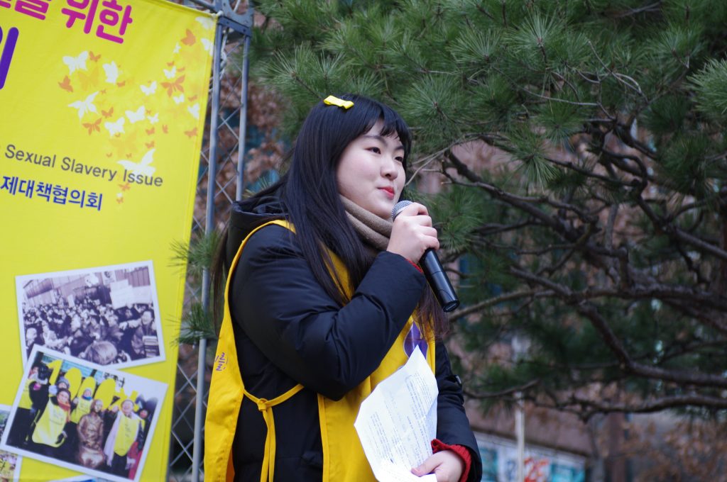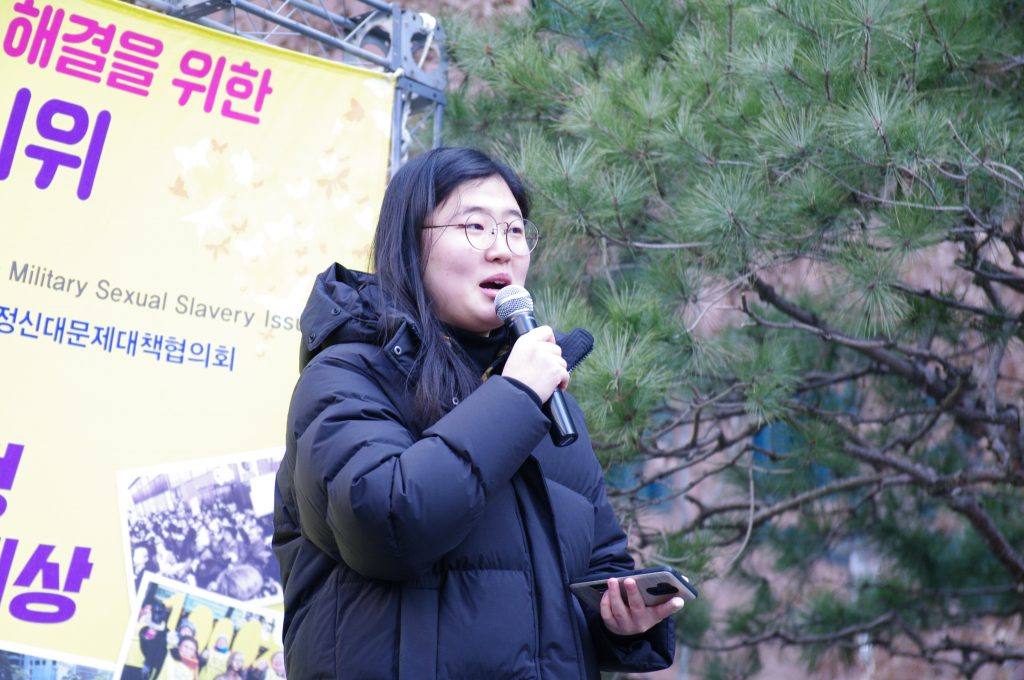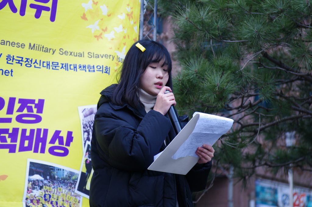 참가단체 소개에 이어 제주오현고등학교 조재훈 최진우 님, 이화나비 지부장 서혜린 님의 자유발언이 이어졌고, 마지막으로 성명서 낭독 후, 1371차 수요시위는 마무리 되었습니다.