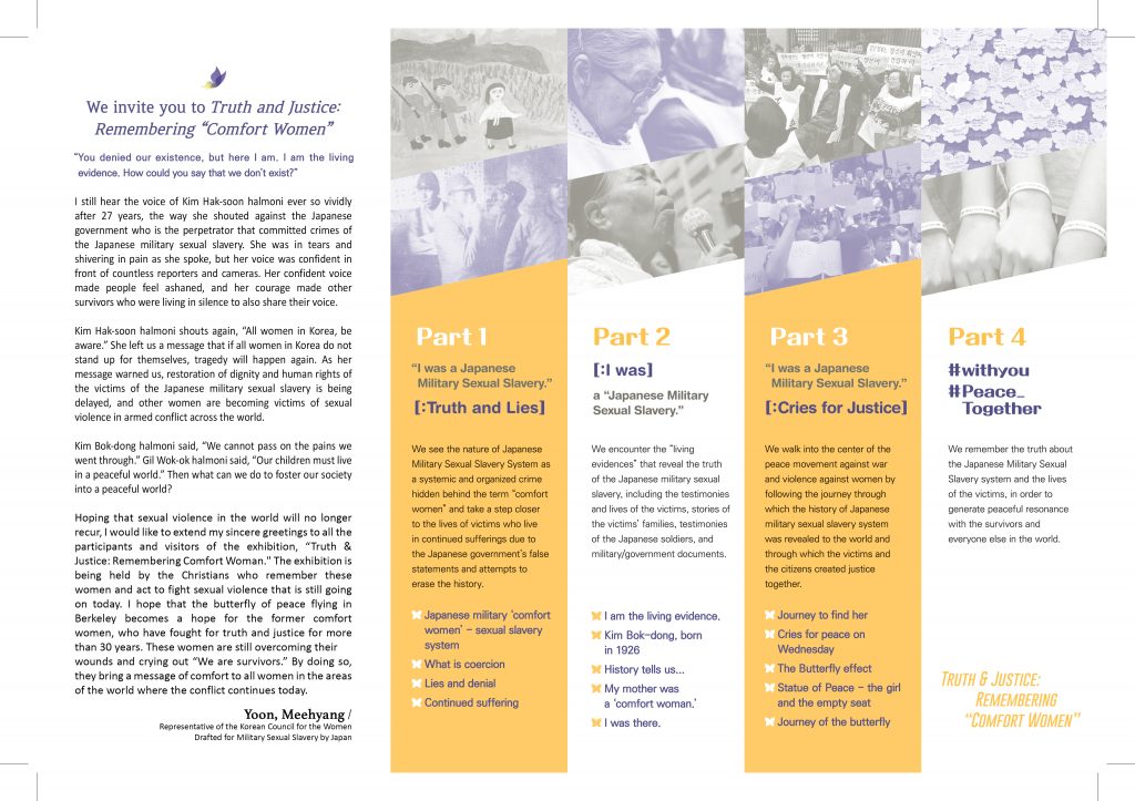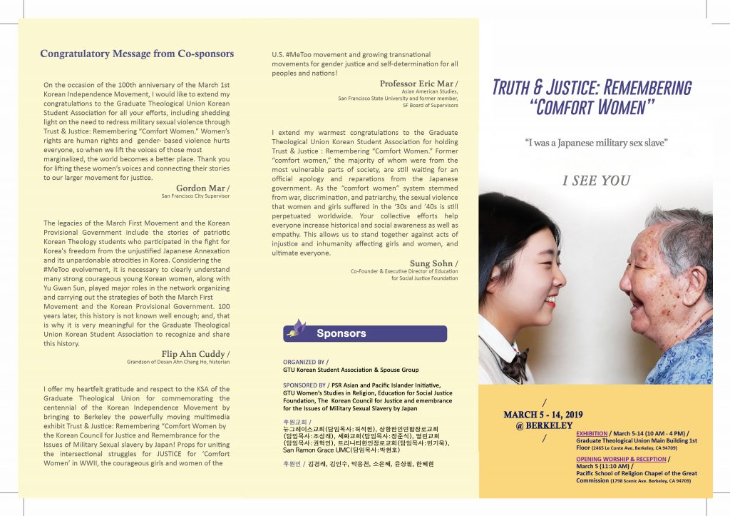 2018년 9월 시카고와 샌프란시스코에서 성황리에 진행되었던 <진실과 정의 그리고 기억 - 일본군성노예였다- > 전시가 버클리 연합신학대학원 한인학생회의 주최로 3월 5일부터 14일까지 개최됩니다!