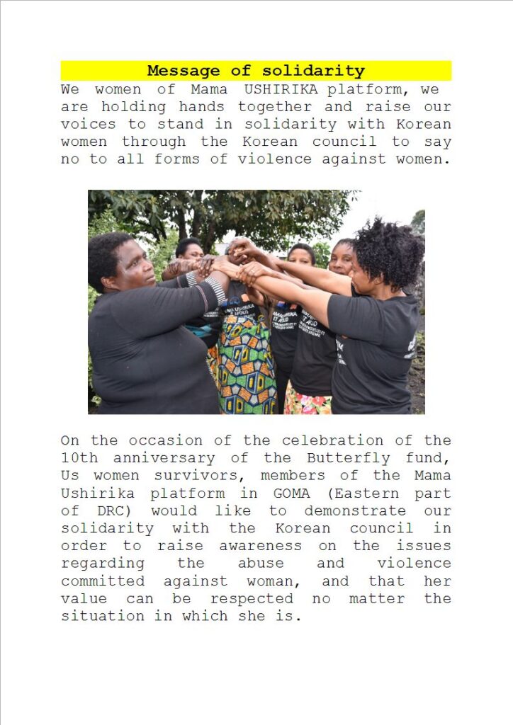 나비기금 10주년을 맞이하여 DR콩고 동부 고마 시의 마마유시리카 회원인 우리 여성 생존자들은 정의기억연대와의 연대하고 있습니다. 우리는 함께 여성에 대한 학대와 폭력 문제에 대한 인식을 높이고, 어떠한 상황에서도 여성의 존엄이 존중받을 수 있도록 활동하고 있습니다.