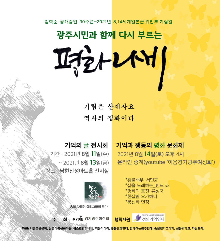 김학순 공개증언 30주년_2021년 8.14세계일본군 위안부 기림일을 맞아 경기도 광주시민들에게 일본군 성노예제의 진실을 알리고, 함께 기억하고, 함께 행동하자는 내용의 행사가 진행될 예정입니다.