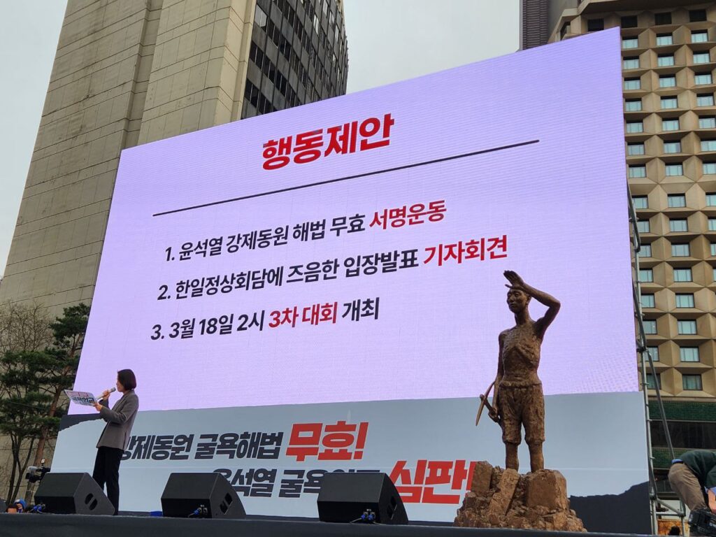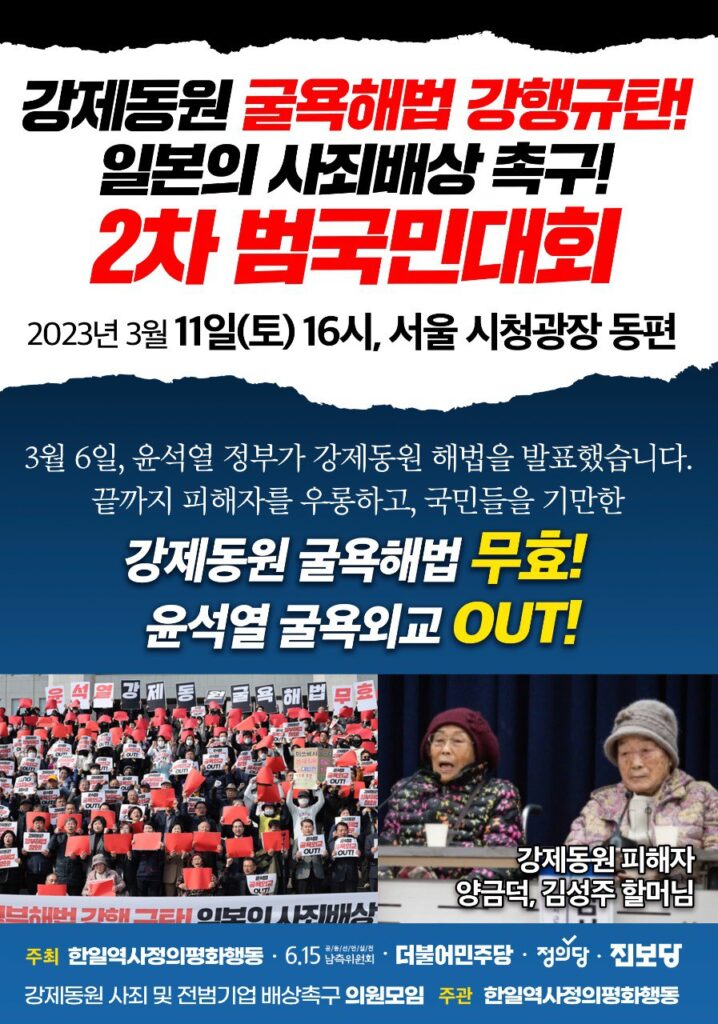 3월 6일, 국민적 반대에도 불구하고 윤석열 정부가 강제동원 굴욕해법을 발표했습니다. 강제동원 피해자를 우롱하고, 국민들을 기만하는 정부 해법에 대한 규탄 성명이 연일 쏟아지고 있습니다. 6일 강제동원 피해자 양금덕 할머니께서 직접 반대 의견을 밝혔고, 7일에는 강제동원 피해자 양금덕, 김성주 할머니와 함께 국회의원, 시민단체, 양대노총, 원로 등 1532개 단체와 9632명의 개인이 연명한 <굴욕적인 강제동원 정부해법 강행 규탄! 일본의 사죄배상 촉구! 긴급 시국선언>이 발표되었습니다. 더욱이 이 해법으로는 강제동원 문제를 해결할 수 없음이 피해자 및 대리인단, 이 외 전문가들의 입장을 통해서 확인되고 있습니다.